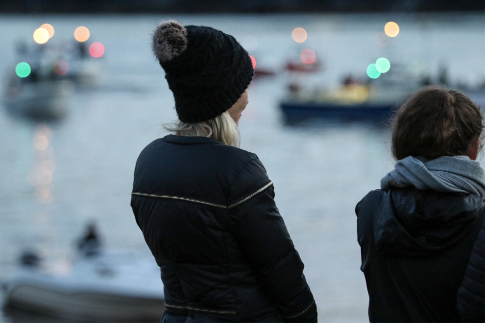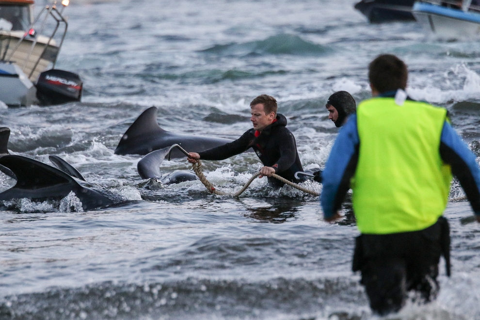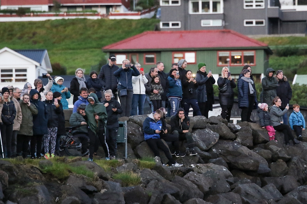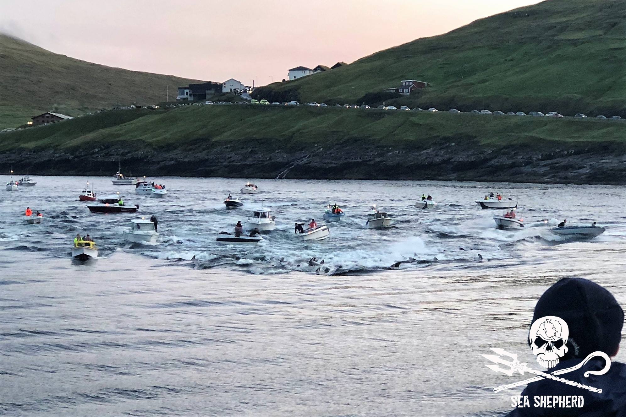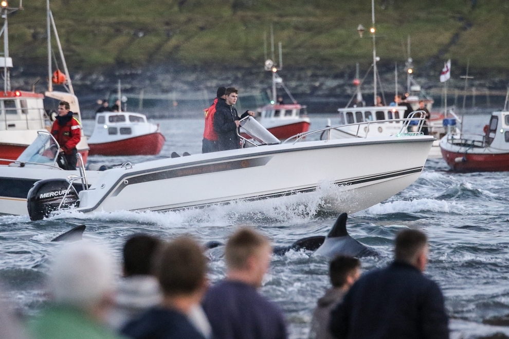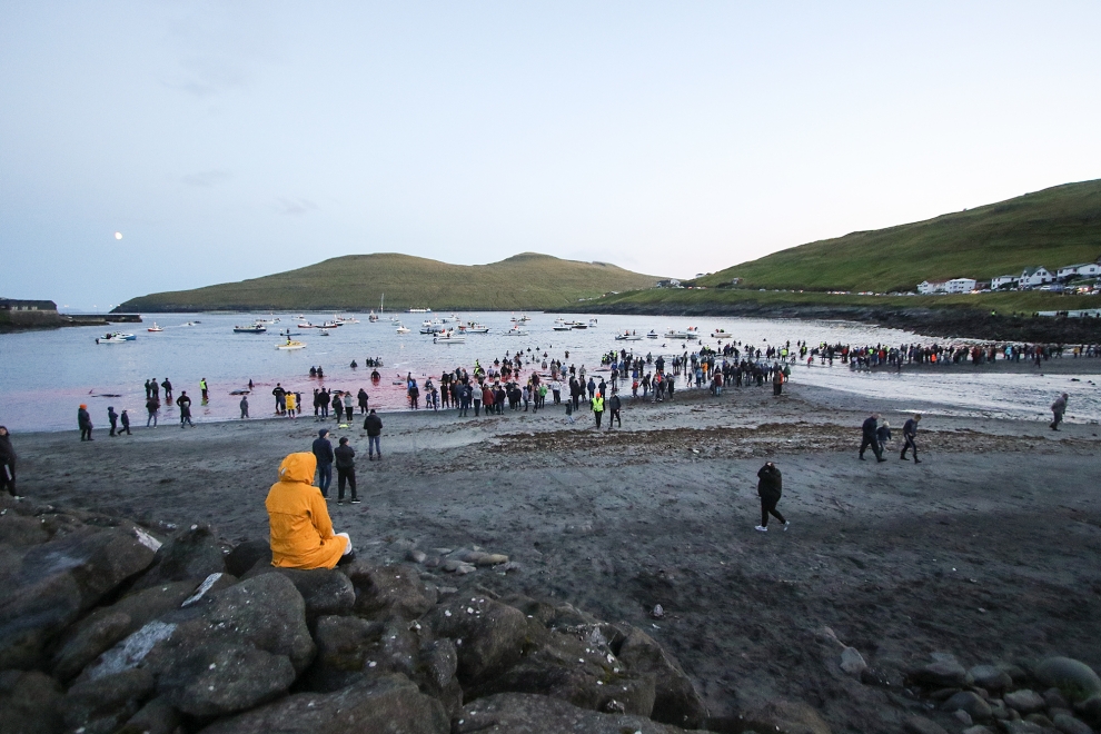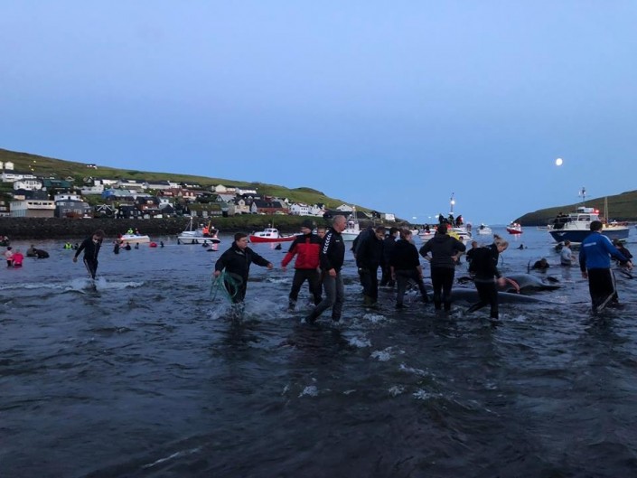 Färöische Boote, Speedboote, Jetskies, Luxusjachten schikanierten und zwangen eine grosse Pilotwal Delfinfamilie über 7 Stunden der SW-Küste entlang vor der Insel Vágar hoch und runter. Zuerst versuchen sie die Delfinfamilie in die Tötungsbucht von Sandavágur zu treiben, als sich die Delfine ihnen entgegenstellten, wurden sie dann hinauf nach Bøur und nun zurück nach Sandavágur getrieben, wo die ermüdete, geschwächte Delfinfamilie nun von mehr als 35 Booten zum Strand getrieben und getötet wurde.