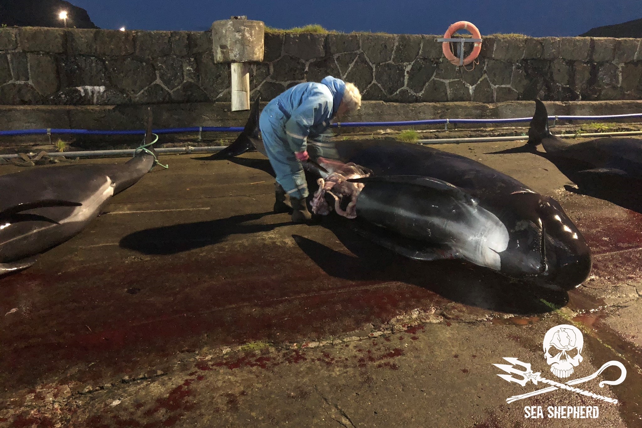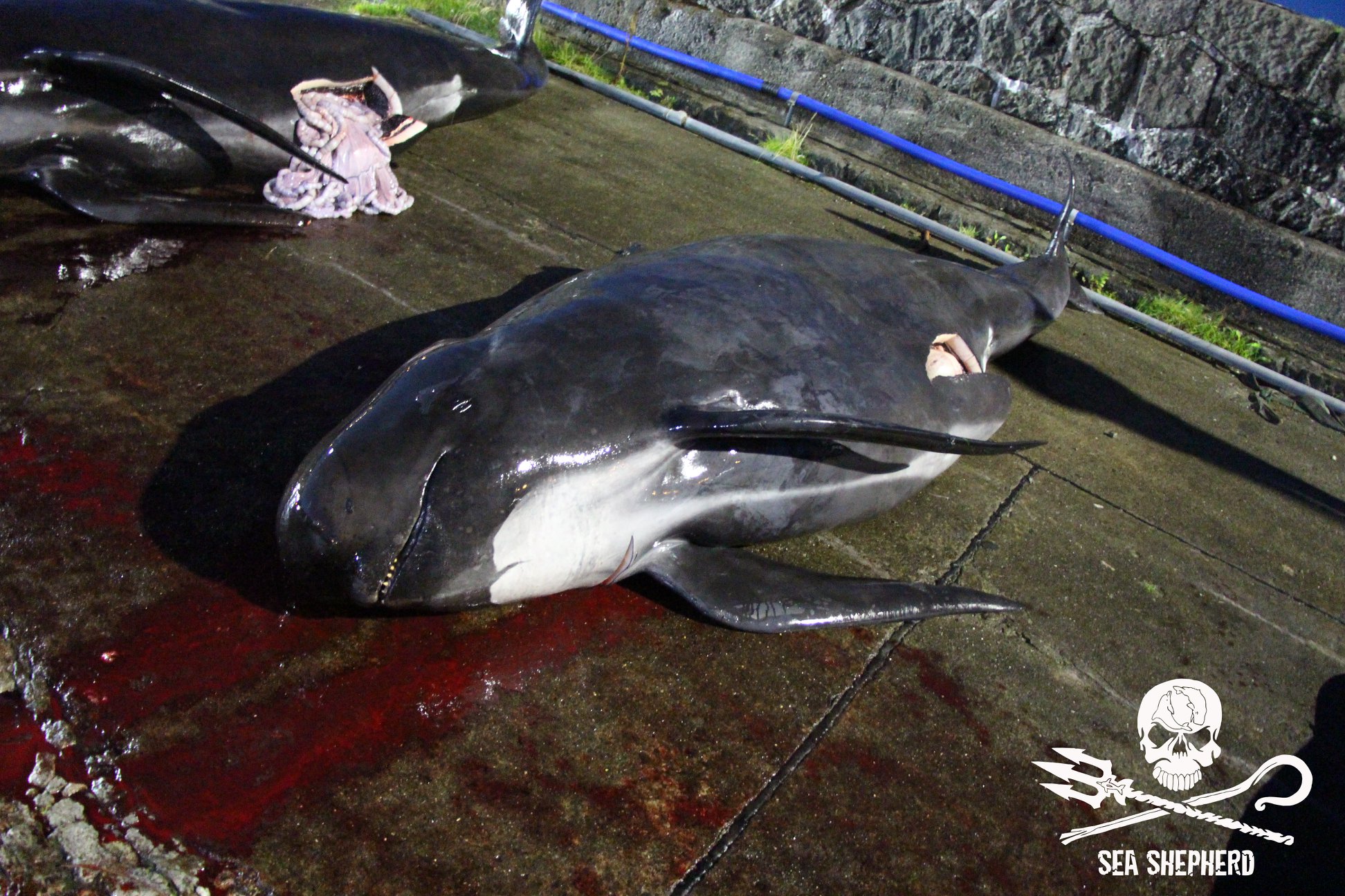 Wir gehen davon aus, dass einige Delfinbabys die siebenstündige Tortur nicht überlebt haben und ertranken. Nur schon die Tatsache, dass eine siebenstündige Treibjagd stattfand, zeigt doch die Schwere der Verbrechen an den wehrlosen Delfinen schon im Vorfeld bevor die barbarische qualvolle Schlachtung überhaupt anfängt.