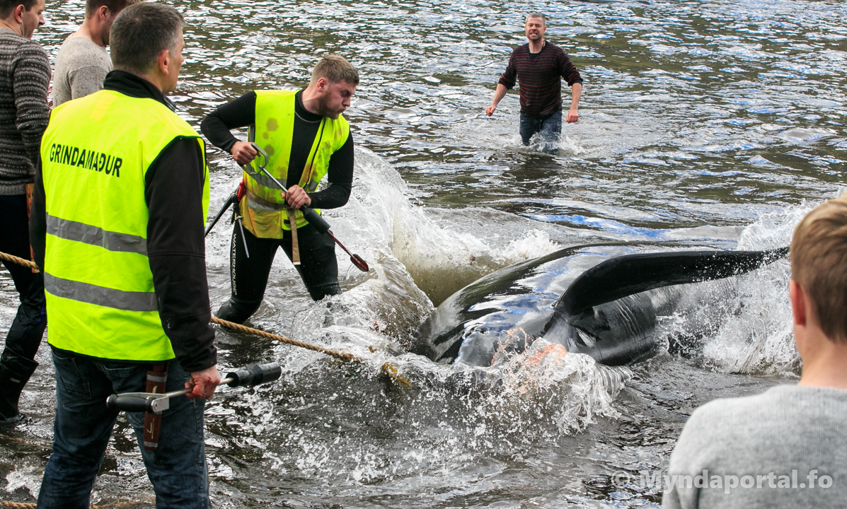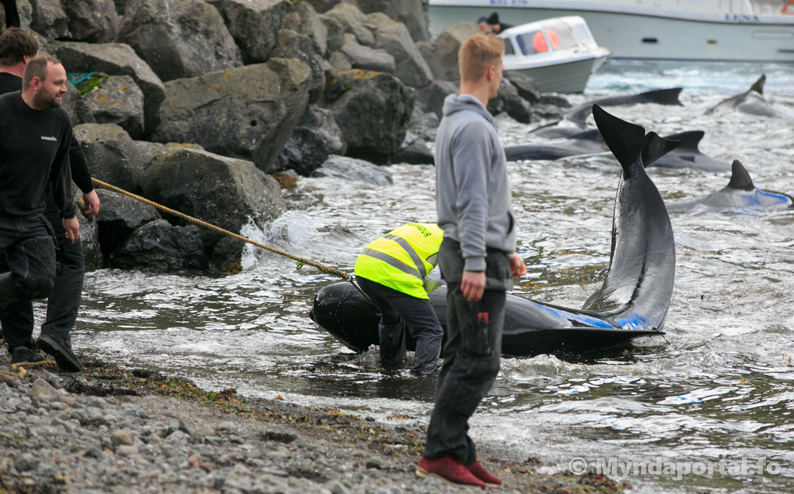 Rund 80 Langflossen-Grindwale, oder Pilotwale genannt, lateinisch Globicephala Melas, die zu den grossen Delfinen gehören, und 13+ Atlantische Weißwangendelfine wurden in den Färöer Inseln barbarisch abgeschlachtet. Drei Pilotwale, darunter ein Kalb und ein Delfin konnten sich den Mördern an der Küste für längere Zeit widersetzen. Nach erneuter wilder Jagd mit Booten wurden auch sie ermordet.