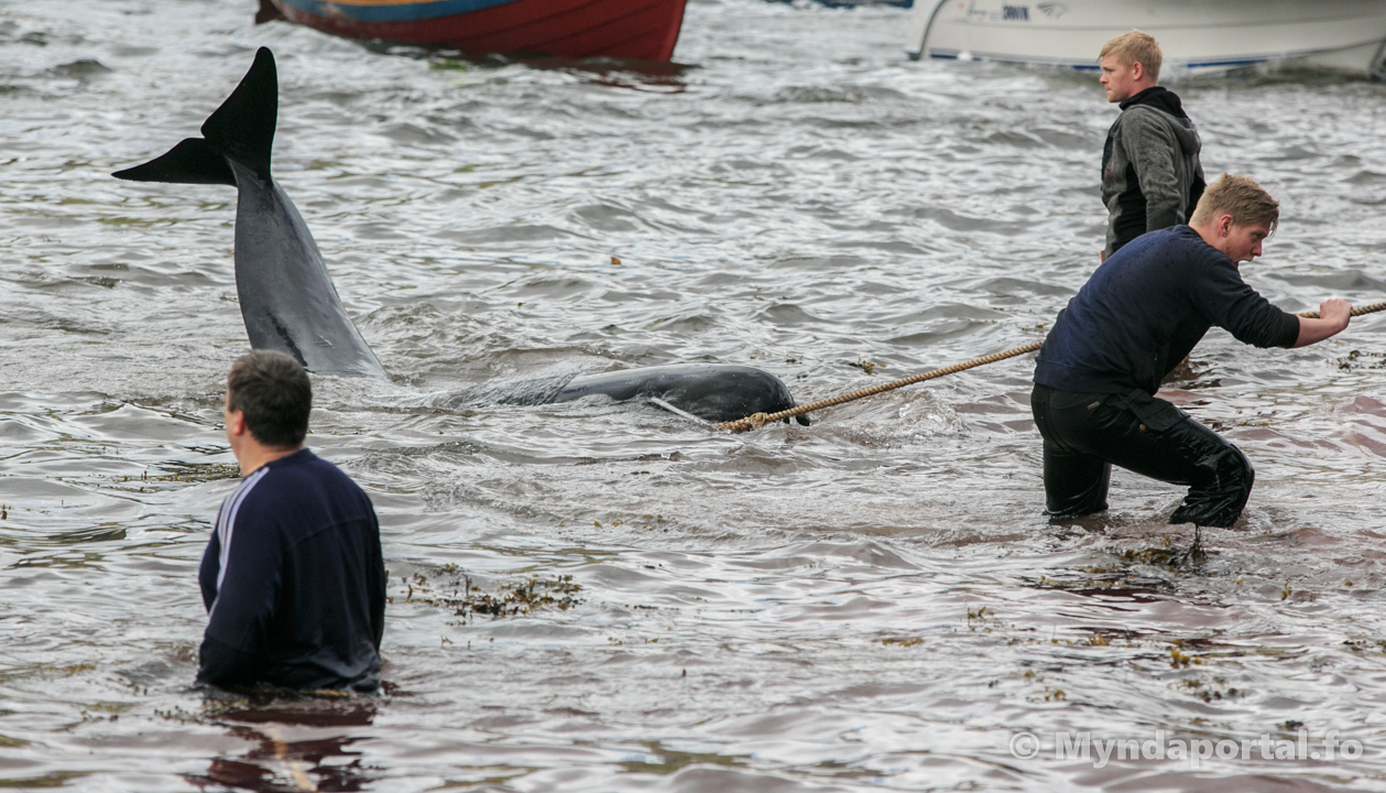 Eine gemischte Delfin Gruppe von 13 Atlantik Weissseitendelfine und über 80 Pilotwale haben heute während der Grindadrap-Jagd unvorstellbar schmerzhafte Grausamkeiten durch die Färöer erleiden müssen. Nur schon die unglaublich grausame Treibjagd durch Motorboote und Jetskies dauerte mehrere Stunden. Viele Babydelfine ertranken während der Treibjagd.