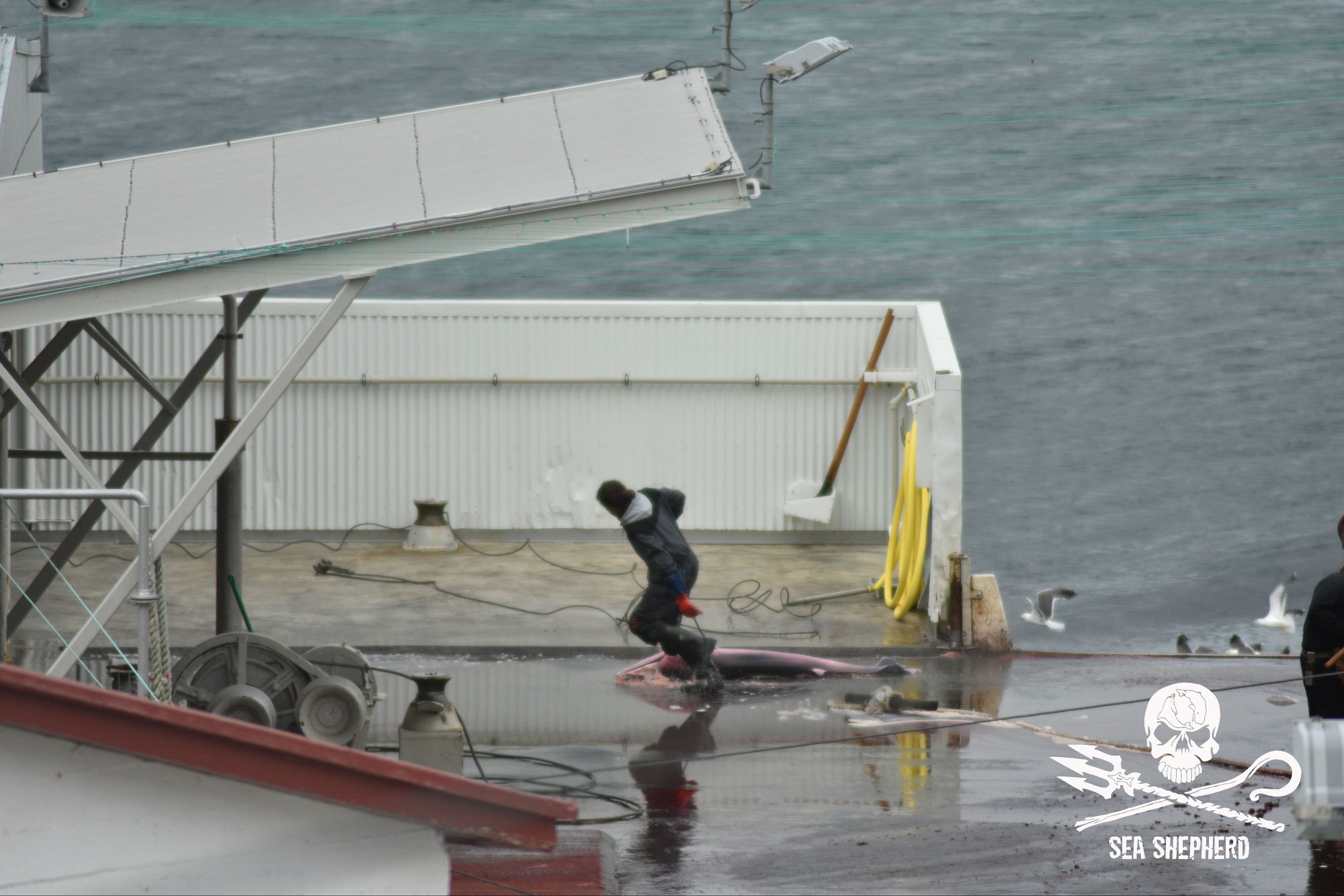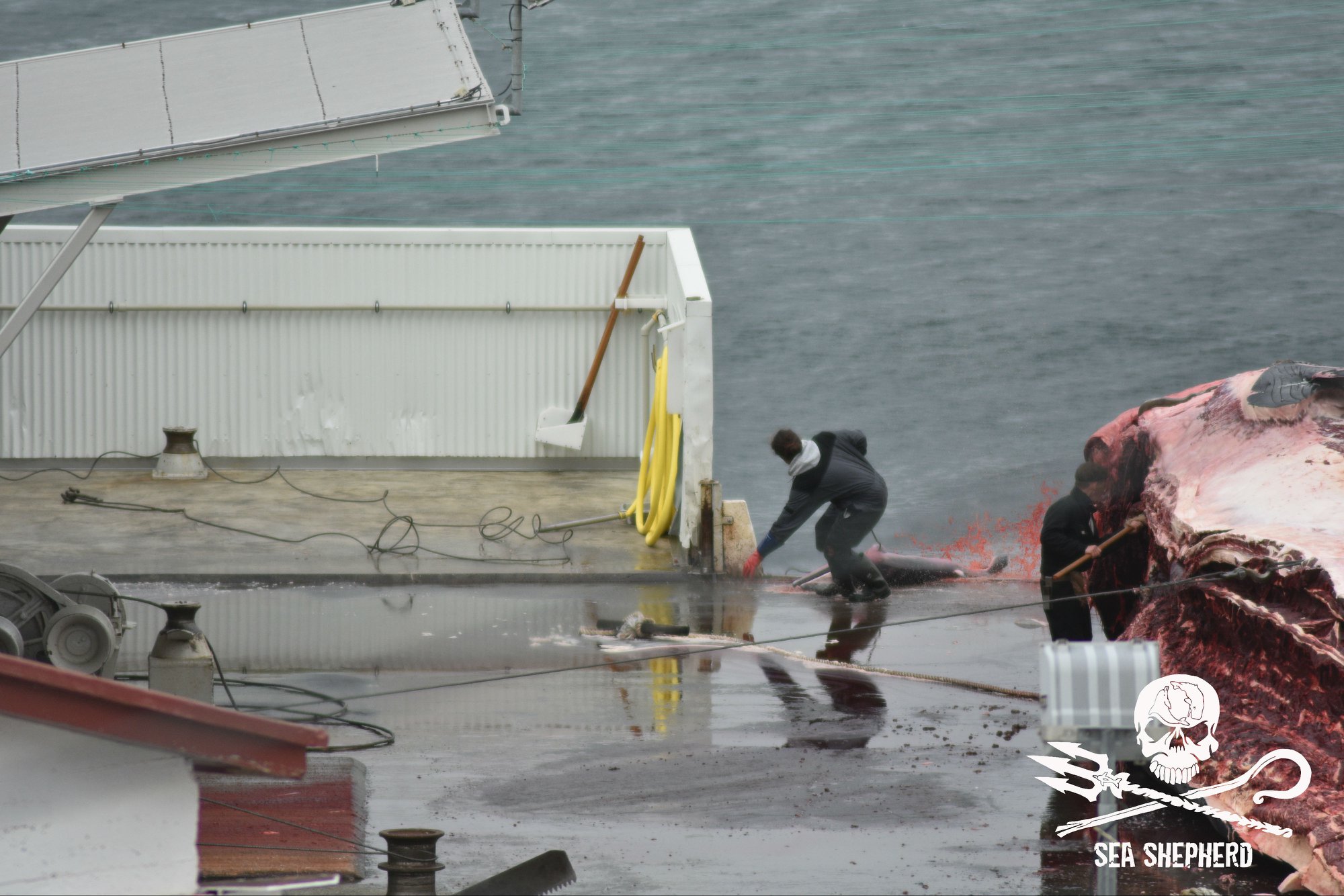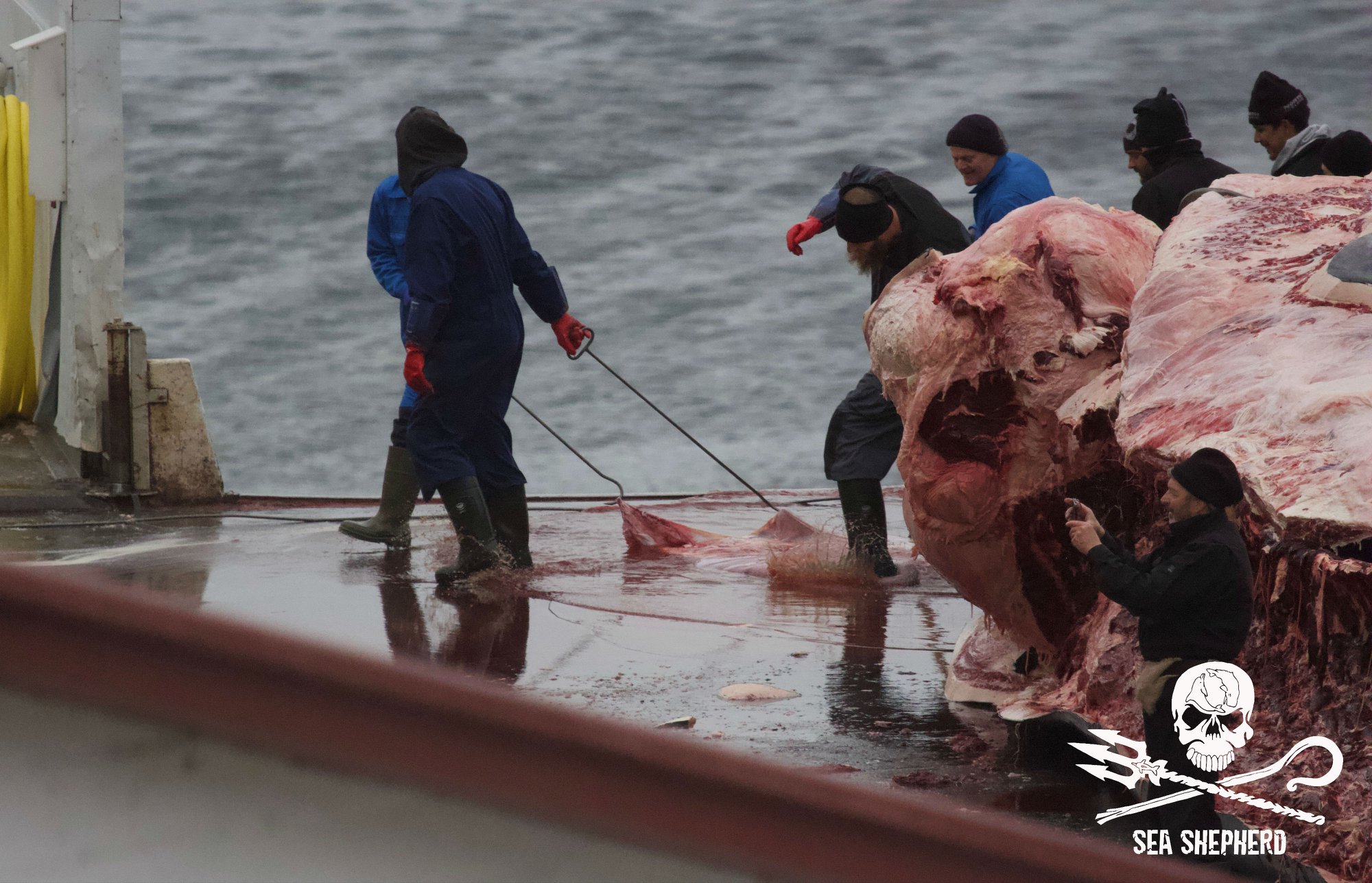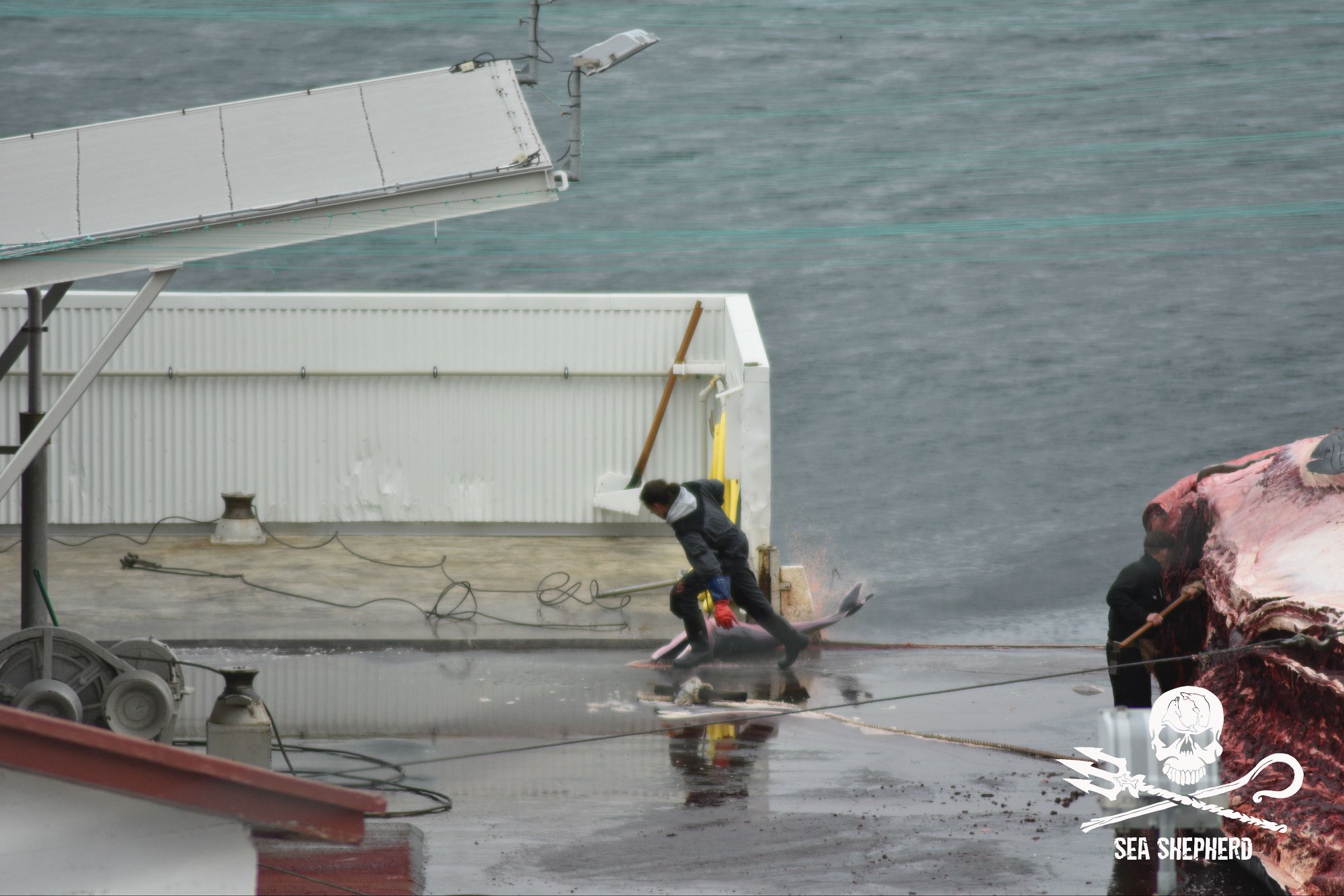 Die Darstellung dieses grausamen Schauspiels konnte die Sea Shepherd Crew nicht täuschen, letztendlich zeigten die Arbeiter ihre wahres Gesicht, ihre Respektlosigkeit gegenüber den gefährdeten Finnwalen, den ungeborenen Kälbern und den schwangerer Weibchen.
