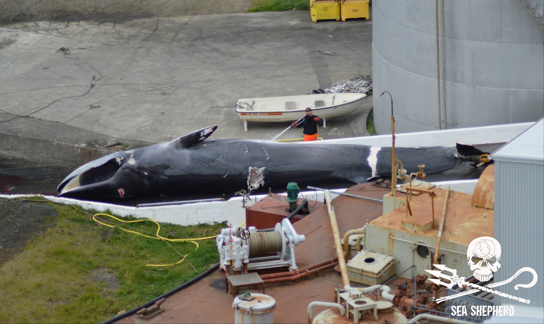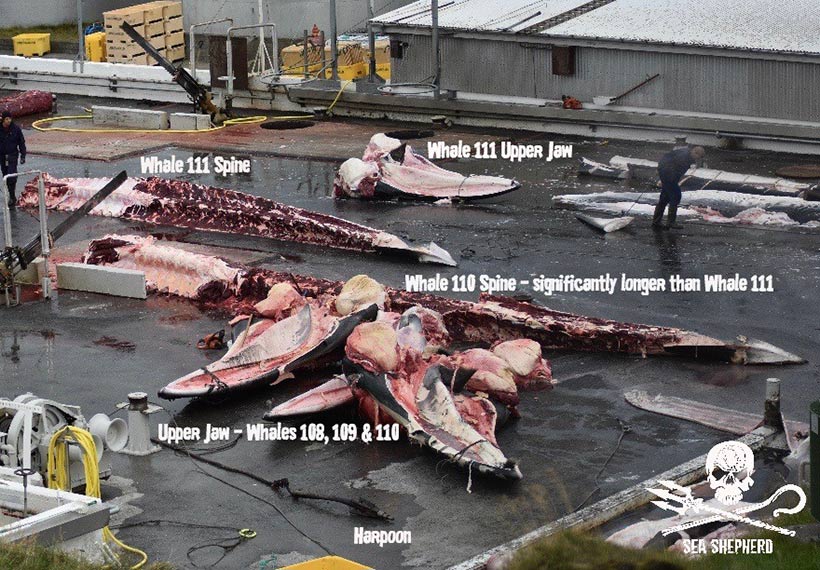 Die Sea Shepherd Crew fuhr mit einem Kajak neben den ermordeten Finnwalen 110 & 111, als sie von Hvalur 8 zur Hvalur Hf Walfangstation gebracht werden. Die Sea Shepherd Crew Filmte für livestream Vidos und fotografierte die ermordeten Wale in nächster Nähe, sie identifizierten den ermordeten vom Aussterben bedrohten Finnwal Nr. 111 als einen jungnen, nicht-ausgewachsenen Wal.