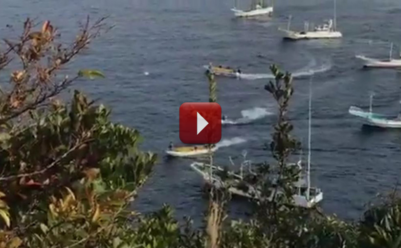 Die japanische Delfin-Jagd-Flotte von Taiji jagte heute Sonntagmorgen eine Risso's Delfinfamilie über vier Stunden lang. Der größte Teil dieser kleinen Delfinfamilie gelang unweit vor der Mörderbucht die Flucht. Zwei Delfine, vermutlich eine Mutter mit Kind, hatten weniger Glück, sie wurden in die Bucht getrieben.