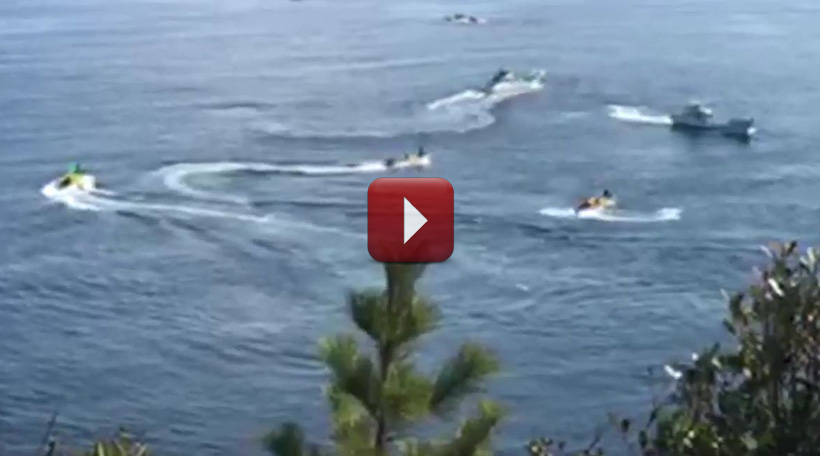 Nach etwa einer Stunde fuhren „Trainer“ in die Bucht ein um Delfine für die Gefangenschaft zu stehlen. Noch einmal wurde diese Delfinfamilie mit Motorbooten terrorisiert um unter die Buch geschoben zu werden wo das grausame Auswahlverfahren stattfand.