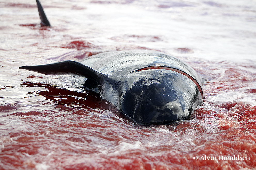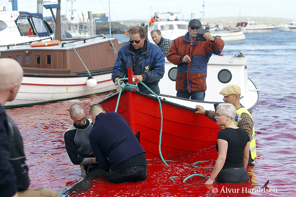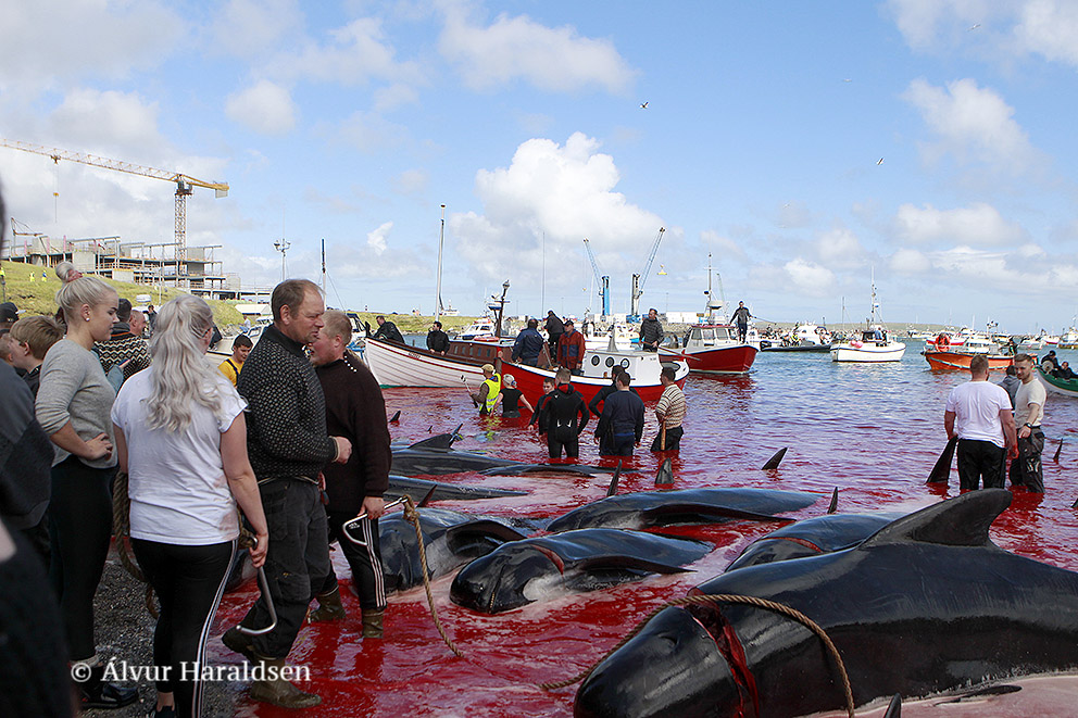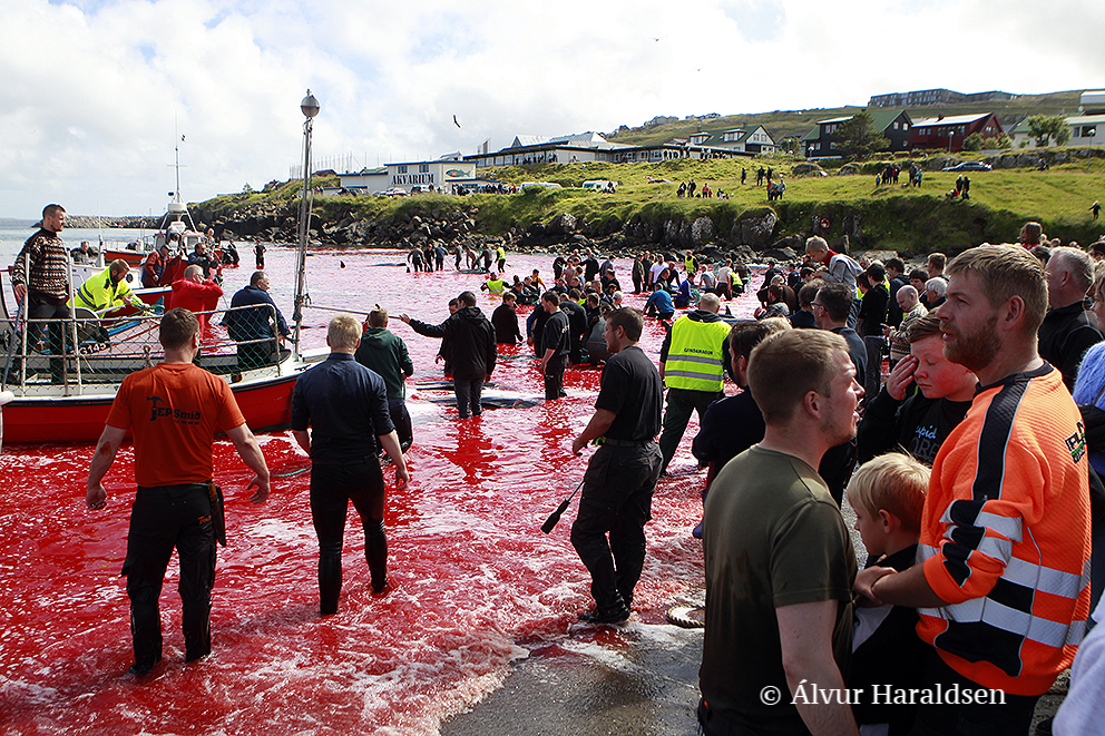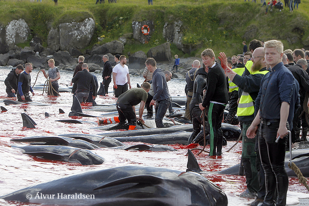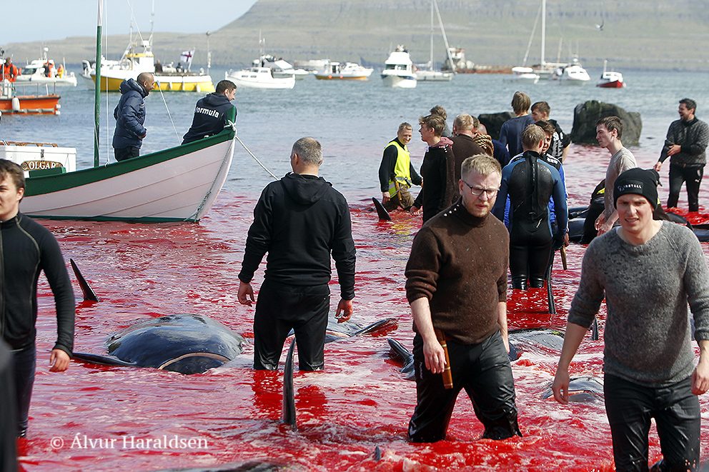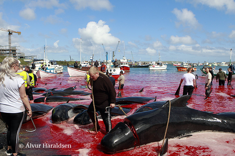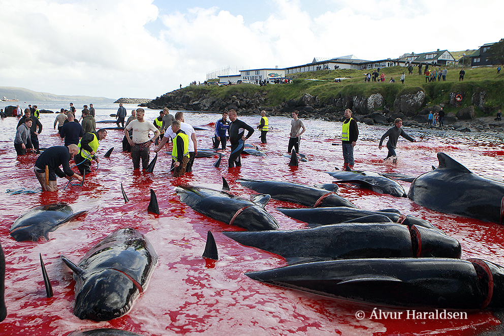 Viele Schaulustige waren vor Ort, viele von ihnen, diejenigen die diese Delfinfamilie über stunden verfolgten und zum Stranden brachten, sowie viele Mörder schossen mit ihren Mobile Phones Selfies wie die Verrückten um damit in den Medien zu protzen. Wie stolz muss ein Färöer sein, in der Welt damit zu prahlen, wie den wehrlosen sanften Wesen zuerst die Wirbelsäule zerstört, danach noch lebend mit langen Messern der Nacken aufgeschlitzt wird.