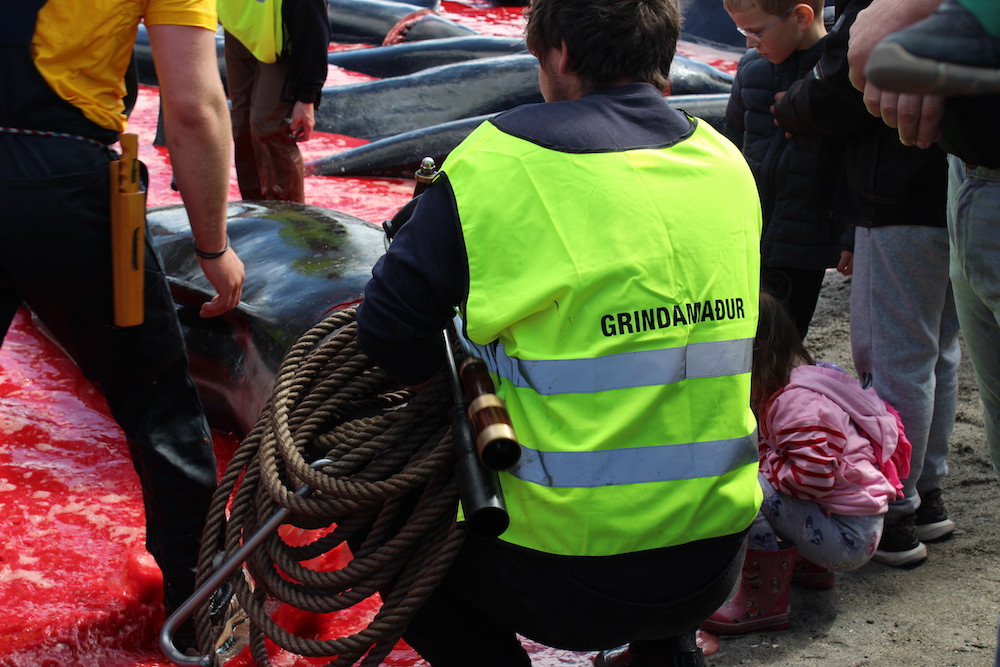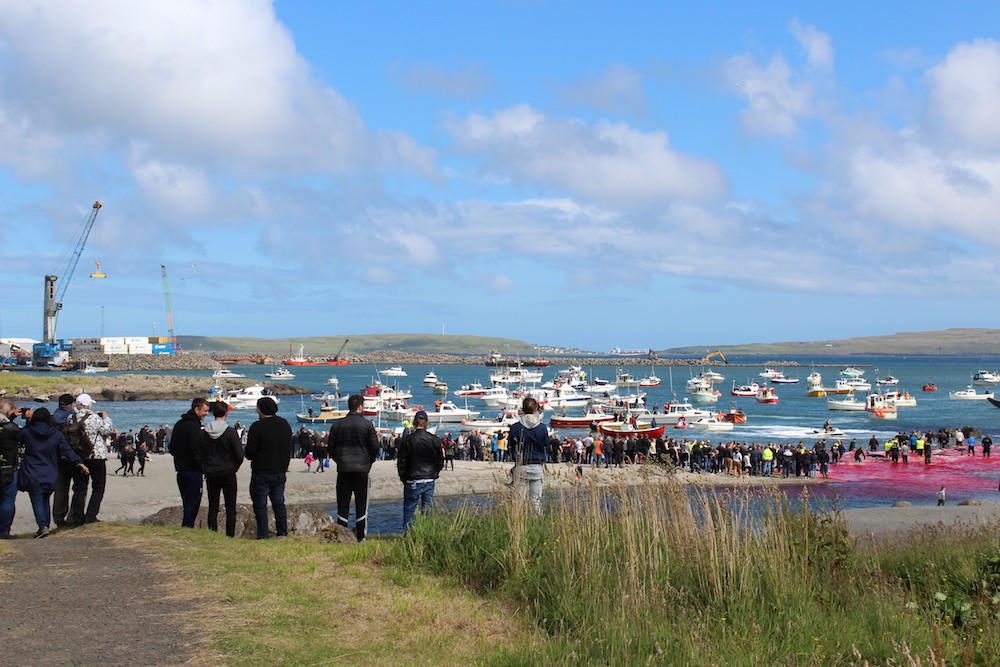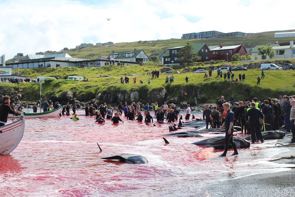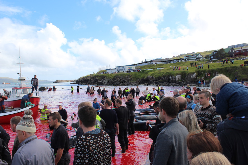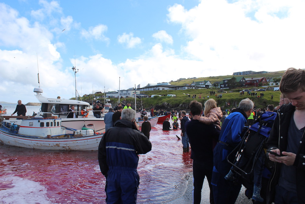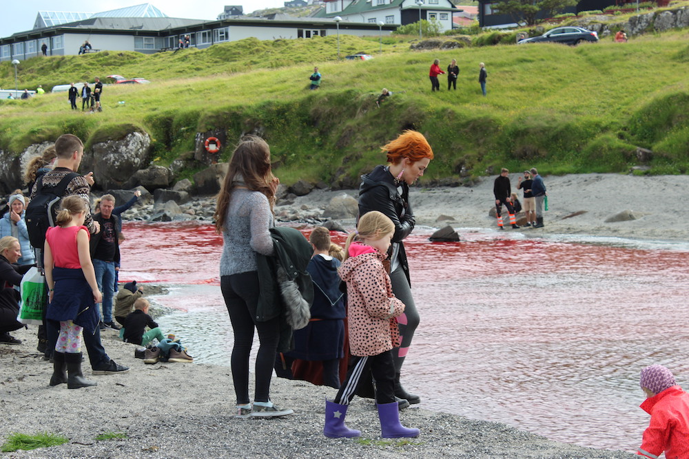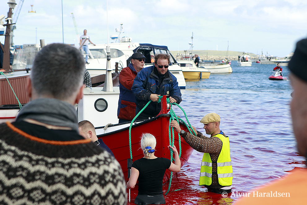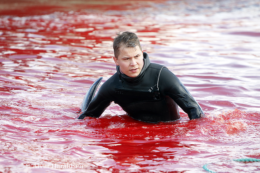 Viele Schaulustige waren vor Ort, viele von ihnen, diejenigen die diese Delfinfamilie über stunden verfolgten und zum Stranden brachten, sowie viele Mörder schossen mit ihren Mobile Phones Selfies wie die Verrückten um damit in den Medien zu protzen. Wie stolz muss ein Färöer sein, in der Welt damit zu prahlen, wie den wehrlosen sanften Wesen zuerst die Wirbelsäule zerstört, danach noch lebend mit langen Messern der Nacken aufgeschlitzt wird.