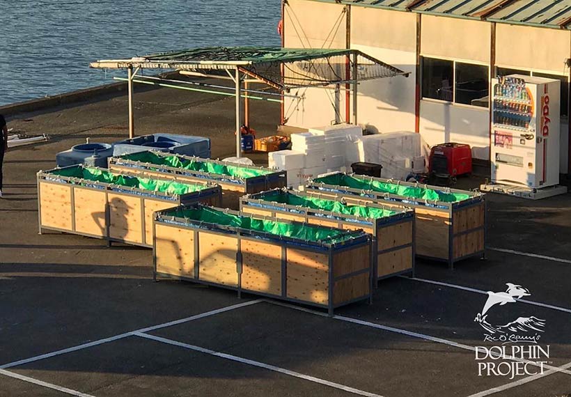 Im späten Nachmittag begann die Delfin Mafia mit den Vorbereitungen für einen Transfer von gefangenen Delfinen. Insgesamt wurden sieben Transportkisten (Särge) aufgestellt.