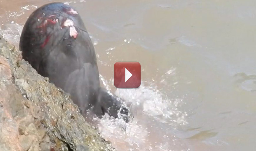 Die Bucht ist immer noch rot und es sind mittlerweile 10 Stunden seit Start des Verbrechens am Morgen um 5:00 Uhr vergangen. Grosse Delfine lagen während des grausamen Mordprozesses völlig erschöpft auf dem Rücken mit der Schwanzflosse an Boote gefesselt. Im Filmmaterial ist dokumentiert, wie einer dieser Delfine ertrunken ist.