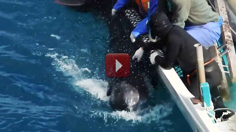 Inmitten von Panik und Angst, während die Delfine in der Bucht mit lauten Bootsmotoren und tödlichen Schiffspropellern einschüchternd an den Strand schikaniert wurden, verfing sich einer heftig im Netz. Einige Killer und ein Taucher brauchten mehrere Minuten um ihn zu befreien, natürlich nur mit der Absicht, ihn an der Schwanzflosse gefesselt ans Ufer unter die Plane zu zerren, damit Delfintrainer und Killer gemeinsam über sein Leben für Gefangenschaft oder Tod entscheiden konnten.