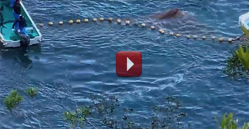 Kaum hinter dem Netz in der Bucht eingesperrt, begannen die brutalen Monster mit ihren Bootsmotoren auf aggressivste weise die Delfinfamilie an den Strand zu terrorisieren.