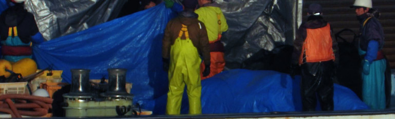 Bild: Auf diesem Boot mit Kran transportieren die Killer getötete Fische, Wale, Haie, Meeresschildkröten und stark von Aussterben bedrohte Meereslebewesen wie Hammerhaie, und sie ertränken an diesem Schiff Wale die in ihre Netze geraten, möglicherweise aus Hass auf Meeressäuger und verwurzelten nazionalistischen Gedankengut aus dem zweiten Weltkrieg, als Japan mit Hitler verbündet war.
