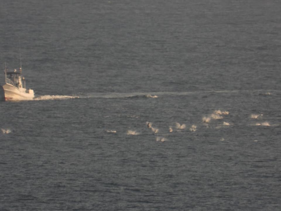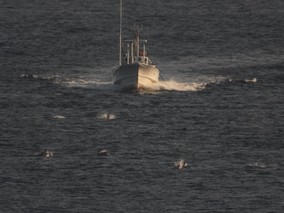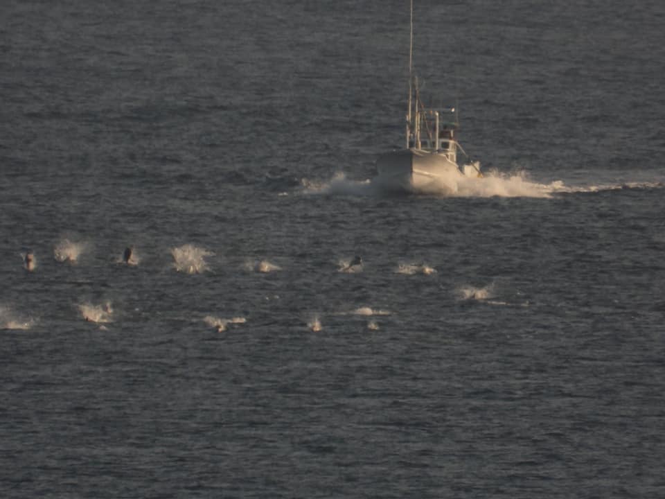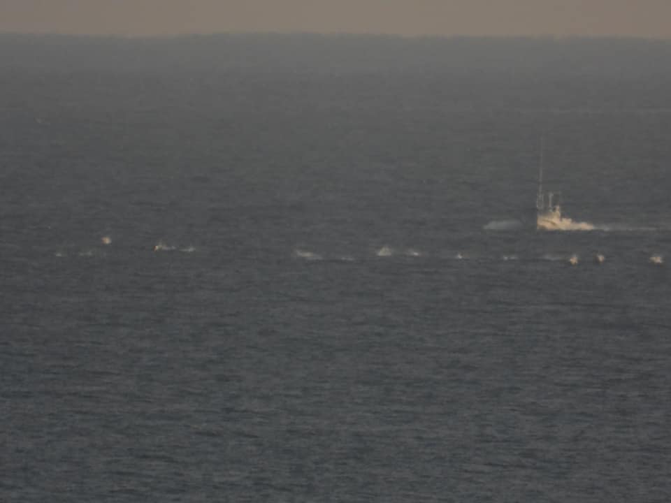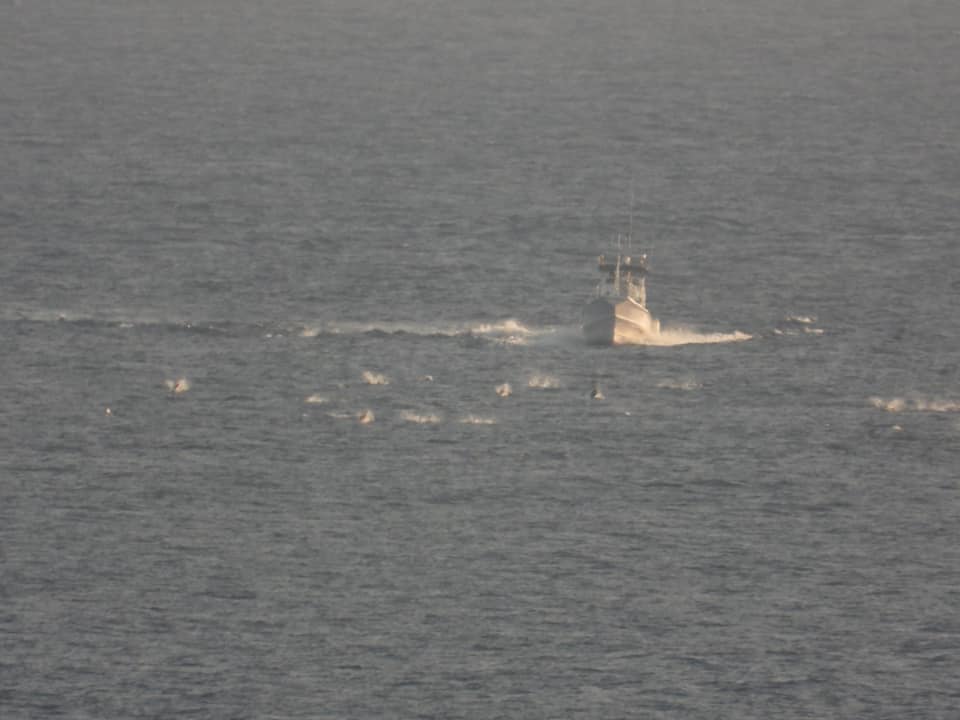 Heute Morgen kurz nach dem die Verbrecher von Taiji den Hafen verliessen um Delfinfamilien zu zerstören, eine Stunde darauf terrorisierten sie eine sehr grosse Gruppe pazifische Weisseiten Delfine in Richtung Bucht.