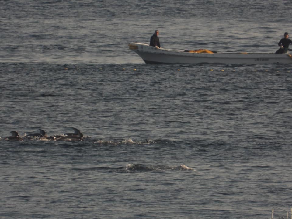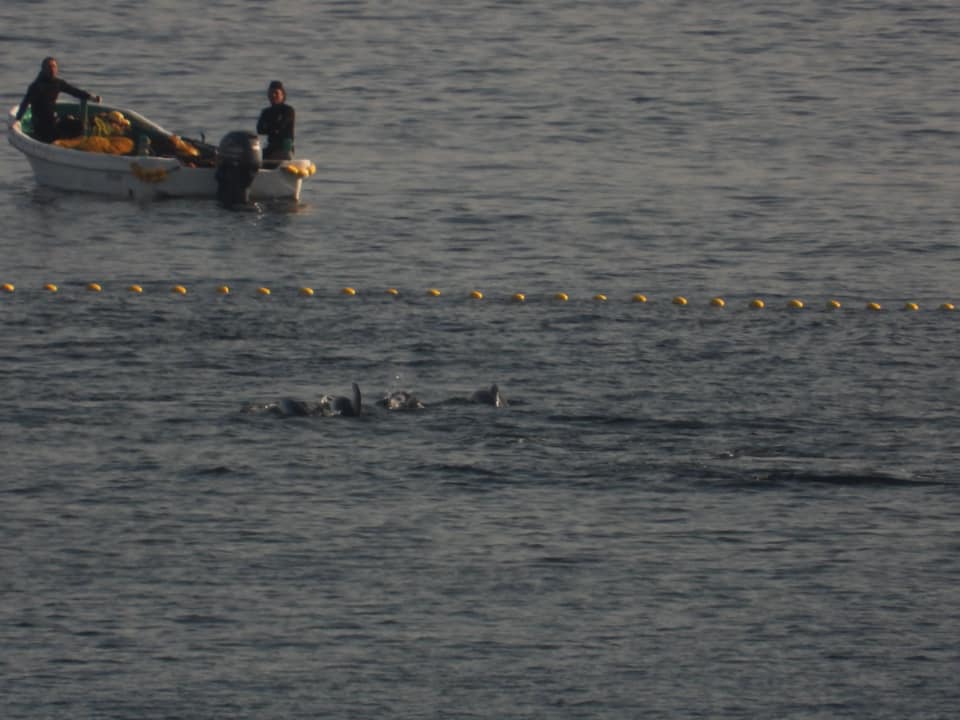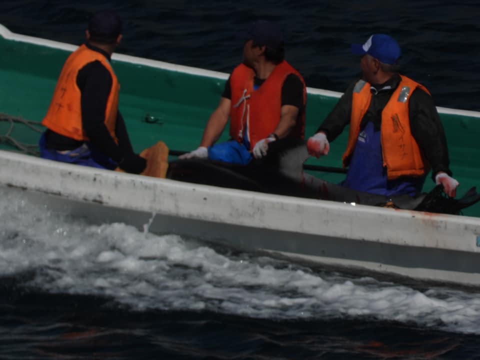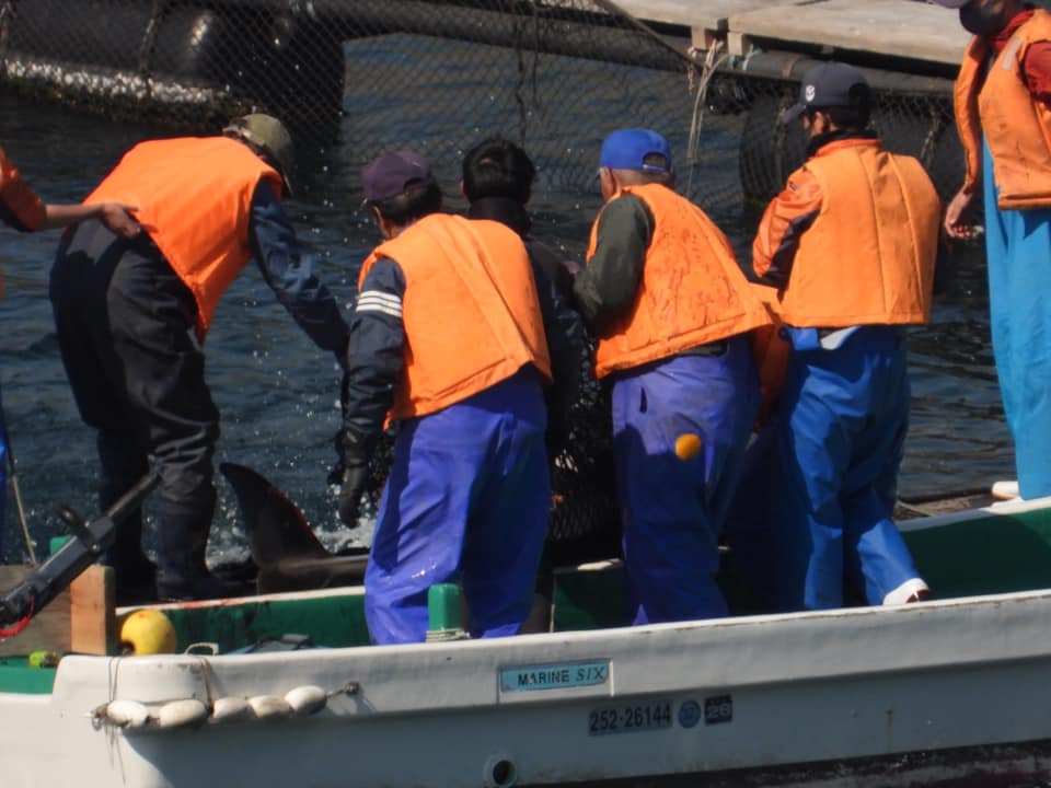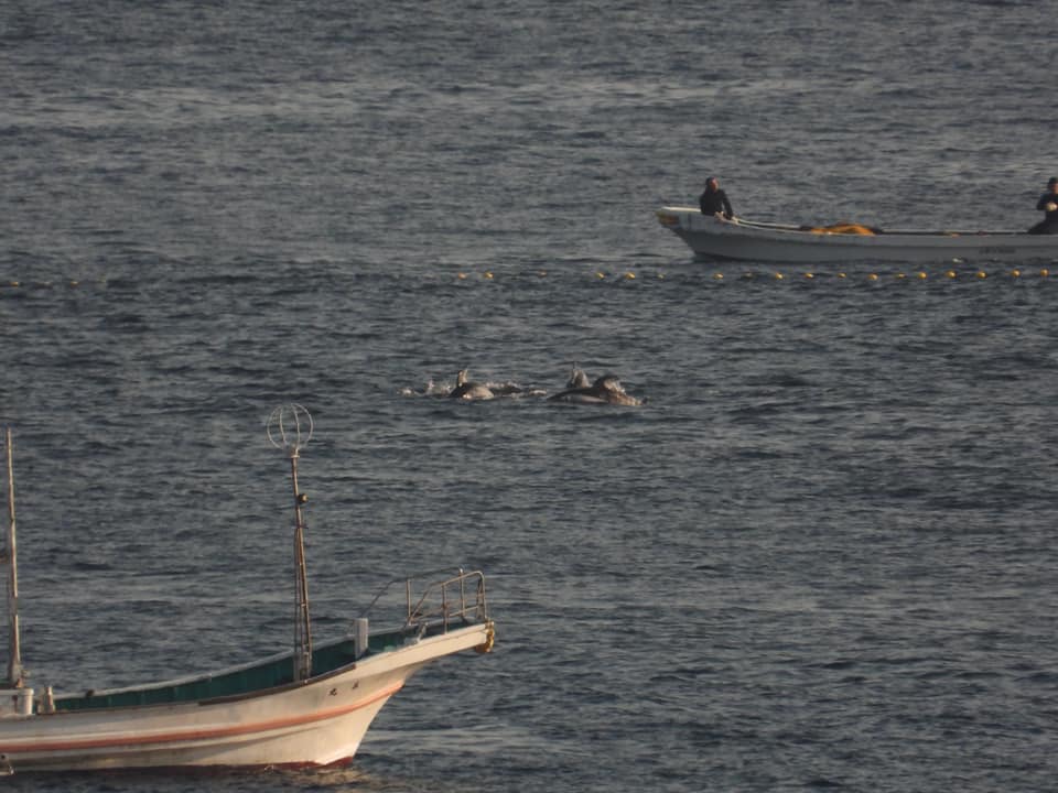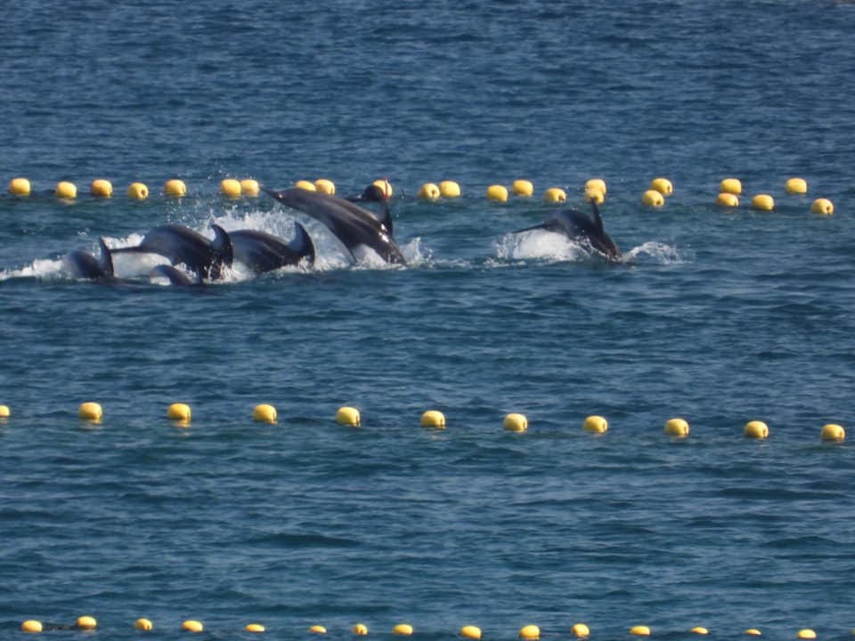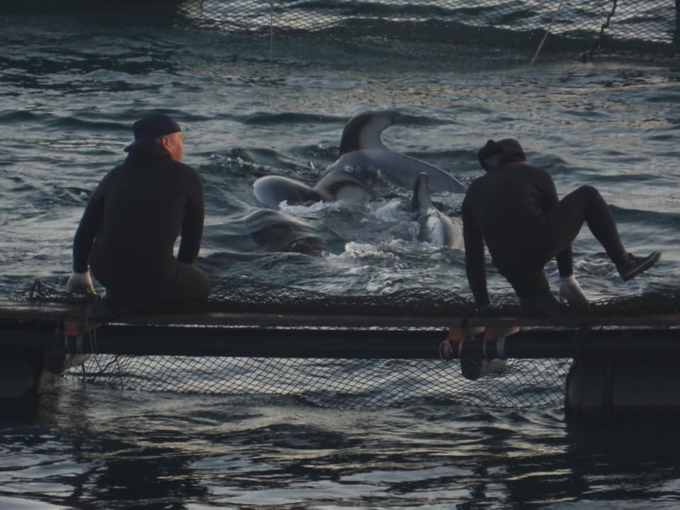 Ein paar wenige Delfine wurden offshore, etwa 600 Meter draussen vor der Bucht mit einem Netz eingekreist. Im Hintergrund sahen wir in Kunito’s Livestream die grosse Gruppe in Richtung Ozean flüchten. Nach erster Einschätzung könnten über 50 Weissseiten Delfine im Netz eingesperrt sein. Wie viele es aber wirklich sind und wie viele von ihnen für die Delfinindustrie entführt werden, erfahren wir erst später.