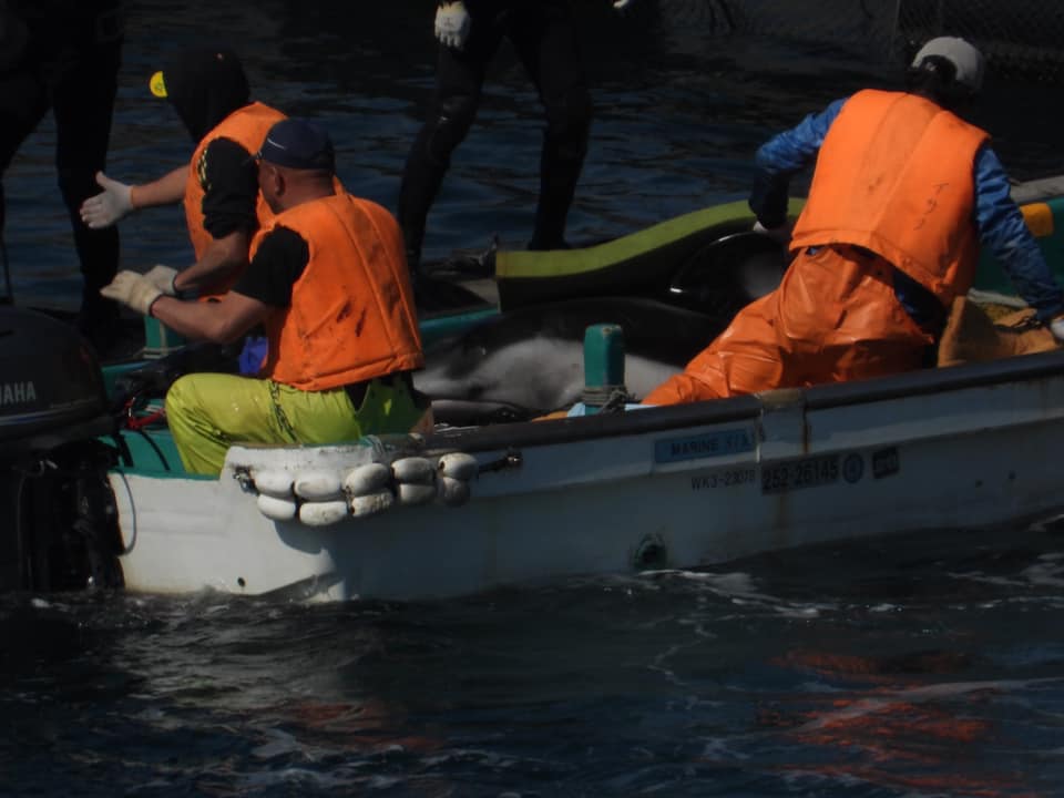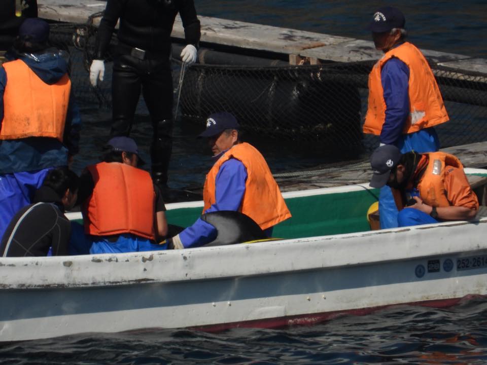 Die Entführungen der auserwählten Delfine, meist Kinder, hatte etwa eine Stunde nach der Treibjagd und Einnetzung begonnen. Die Delfine gerieten in extreme Panik, als Tauche sie packten, wie im Wrestling mit ihnen ringten und zu den Booten in die Netze geschoben wurden. Kunito hatte viele Fotos geschossen, darauf sind viele blutende, verletzte Delfine sind zu sehen. Diese Verletzungen wurden ihnen während der brutalen Gewalt der Treibjagd und Wrestling im Netz zugefügt. Viele Delfine wurden entführt, sechs Stunden waren bereits vorbei, berichtete Dolphin Project, fuhren immer noch Boote, beladen mit entführten, blutenden und zappelnden Delfinen, in den Hafen zu den Käfigen und zurück zum Netz.
