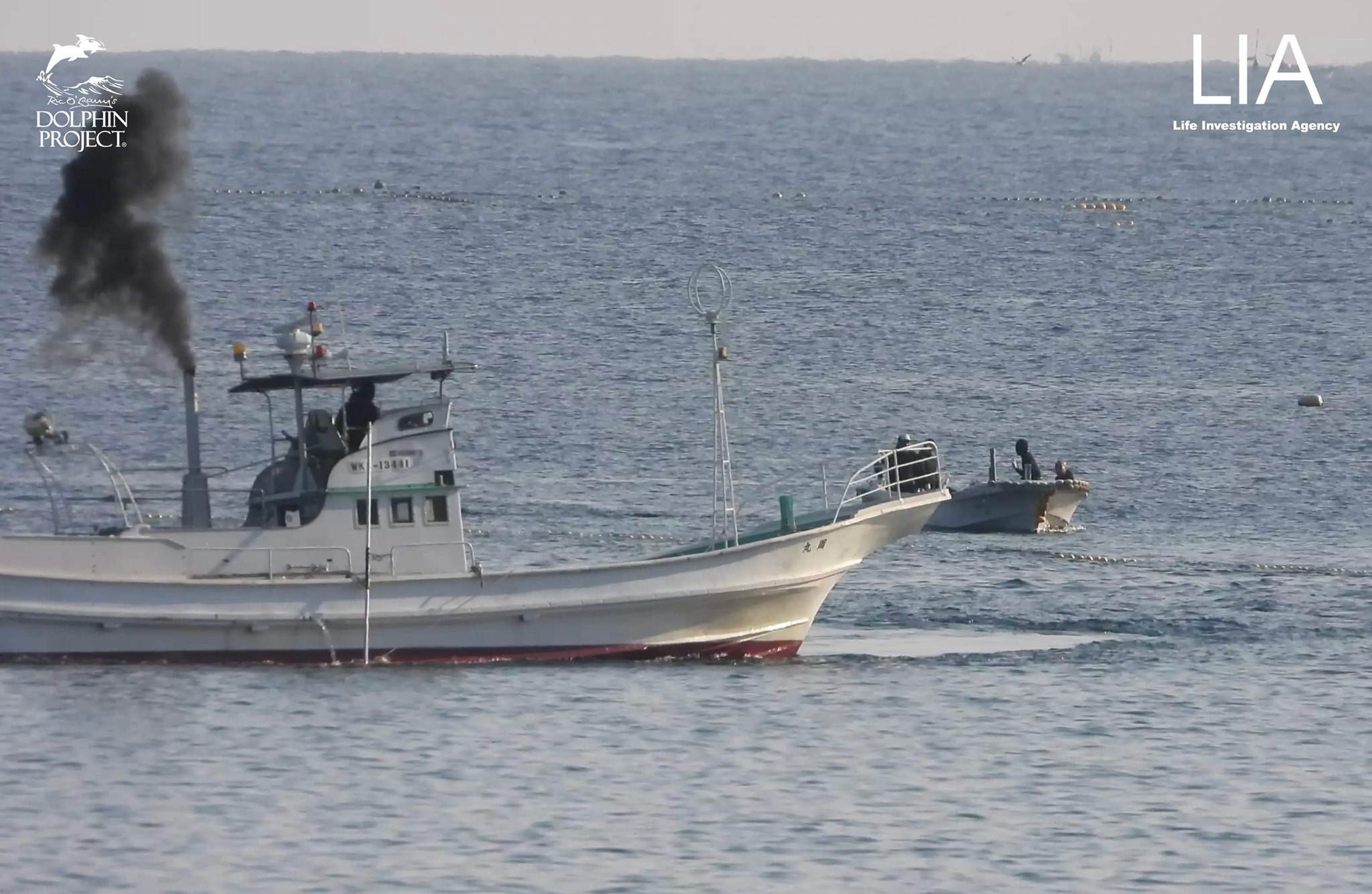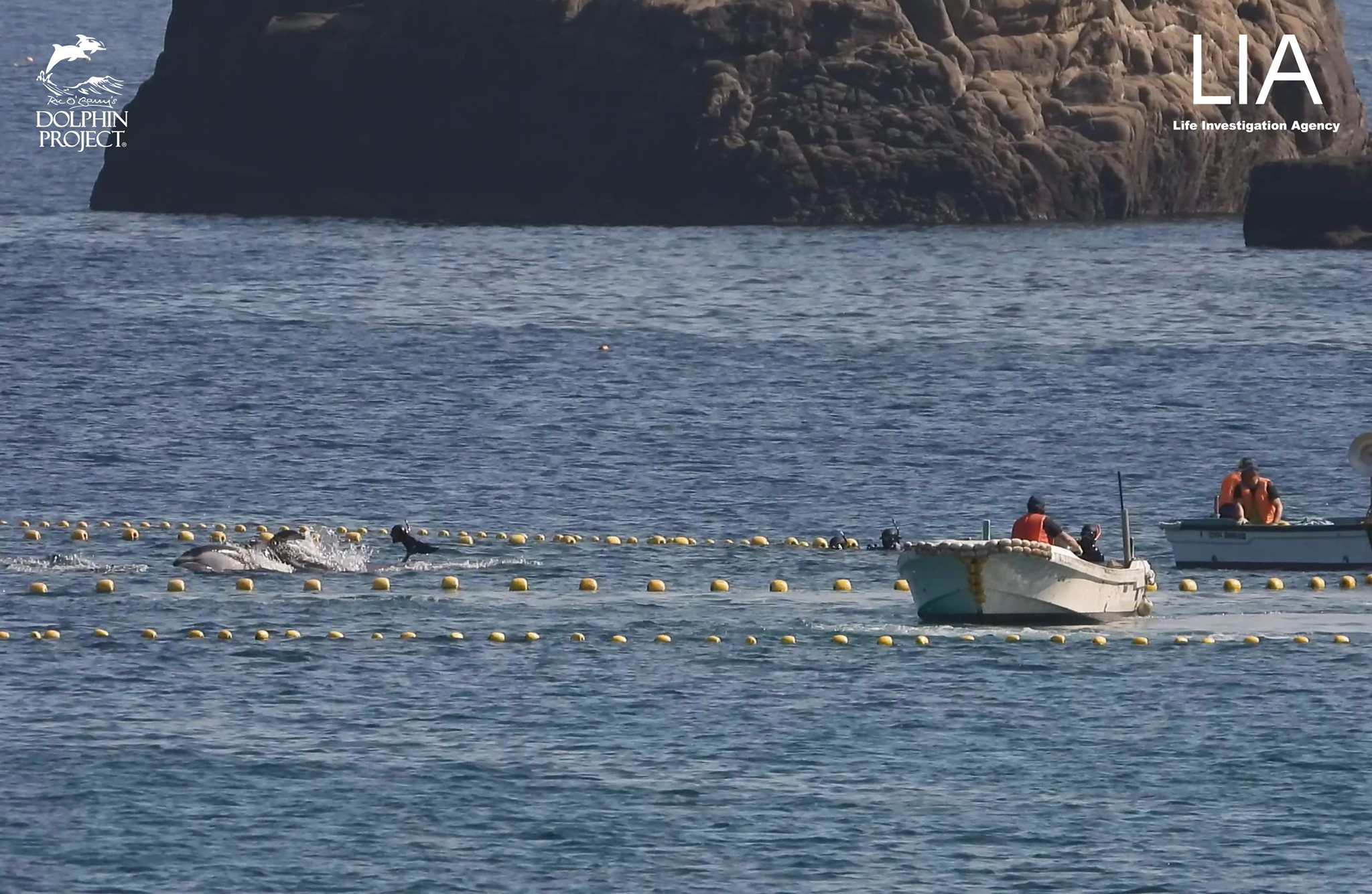 Zuerst haben die Monster mit einem Netz den Delfinen die Flucht in den Ozean versperrt, durch umherrasen machten sie ihnen noch mehr Angst, damit sie untertauchen und an Ort verbleiben, um sie mit dem Netz weiter einzukreisen zu können. Mit zwei Jagdschiffen ziehen sie das Netz näher ans Ufer heran, vor dem Netz rasen Jagdschiffe und Boote hin und her, verpesten mit ihren Rauchschleudern die Umwelt und machen den verängstigten Meeressäugern noch mehr Angst.