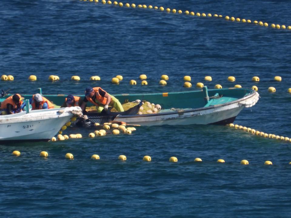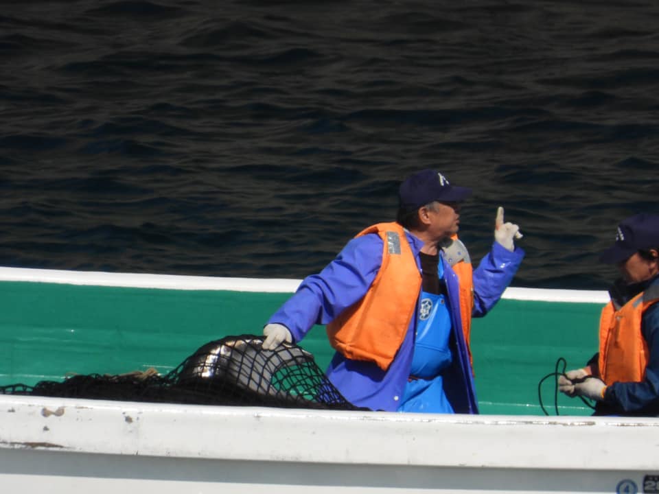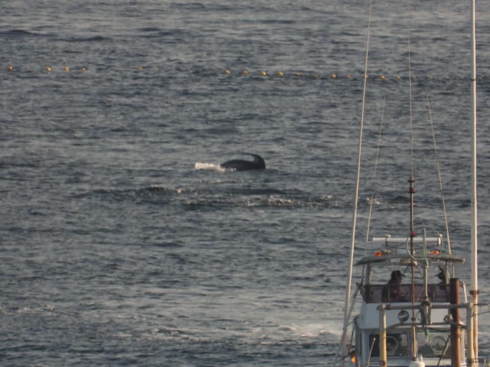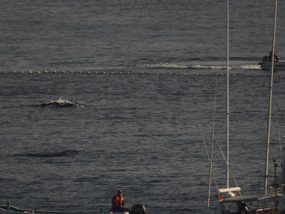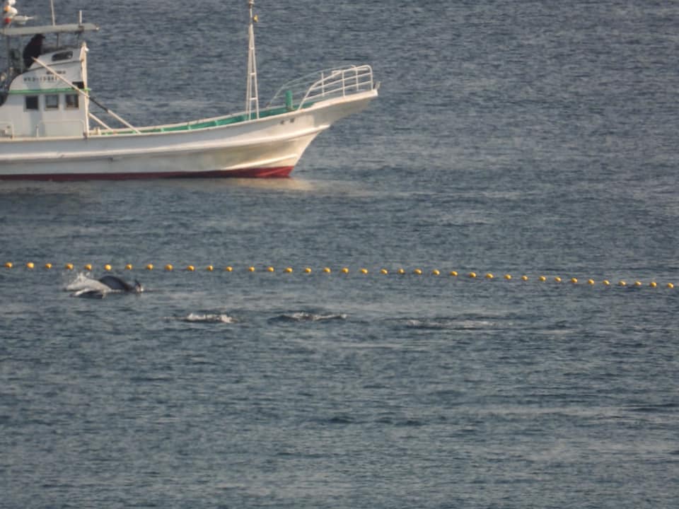Gestern, und heute sind noch mehr japanische Aktivisten in Taiji vor Ort, schreien heftig und andauernd durch Grammophone, übersetzt «Lass die Delfine gehen, lass sie in Ruhe». Einige Jagdschiffen waren schon in den Hafen gefahren, brach plötzlich bei den noch verbleibenden 8 und 6 Booten mit Tauchern und Entführern Hektik auf. Es sah zuerst so aus, als wären die Delfine geflüchtet. Das grosse Schiff, an das der Zwergwal Hope an der Schwanzflosse gefesselt und ertränkt wurde, hat das Netze heute vor den Delfine ausgelegt. Was wiederum bestätigt, dass die Fischer und Delfinjäger ein und derselbe Abschaum sind, nämlich Mitglieder der japanische Delfinmafia der Fishery Union ISANA.
