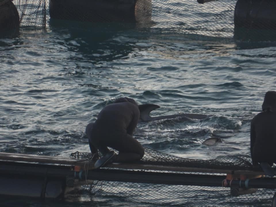 Bild: Killer ziehen ein Schwimmkäfig mit gestern entführten verletzten Weisseiten Delfine auf See hinaus um sie zu entsorgen