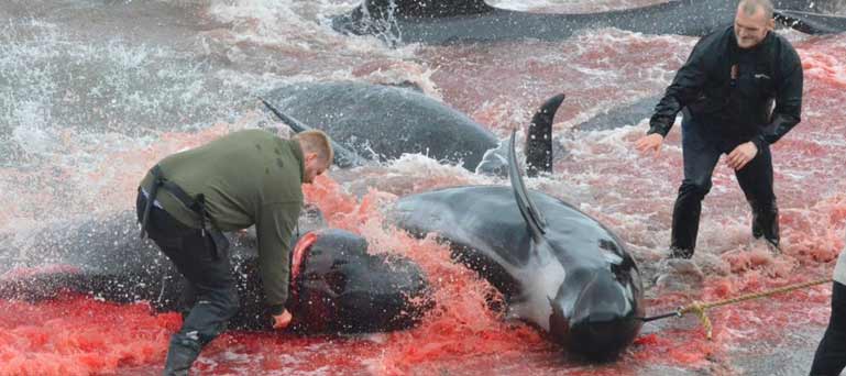 Färöer Inseln: Gestern Samstag Abend wurde eine Delfinfamilie Stunden lang mit 50 Booten und Luxusjachten terrorisiert, gequält und überfahren. 20 Delfine wurden wegen der Fischereiindustrie im sadistischen Färöer Blutsport hingerichtet weil sie den "Fisch der Färöer" gegessen haben.
