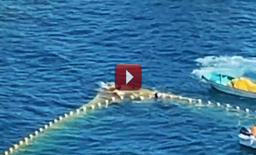 Kunito Seko hatte heute Morgen gemeldet, dass die 12 Jagdschiffe eine Delfinfamilie terrorisieren, so kam es denn auch. Die Jagdschiffe hatten bis zur Bucht einfaches Spiel diese sanften Wesen zu terrorisieren. In der Bucht kam es zur noch grösseren Tragödie als diese brutalen Jagden sonst schon sind, in grösster Panik und Angst flohen die Delfine in eines der Netze vor dem Mörderstrand und blieben daring hängen. Alle Delfine in grösster Panik zu ertrinken, hielten ihren Kopf aus dem Wasser und drückten das netz in die Höhe. Die panischen Meeressäuger schoben das Netz vorsich hin und entkamen nach einigen Minuten untendurch. Der aggressive Abschaum gab sich enorm viel Mühe dieses wehrlosen Wesen mit extremster Gewalt zu quälen.