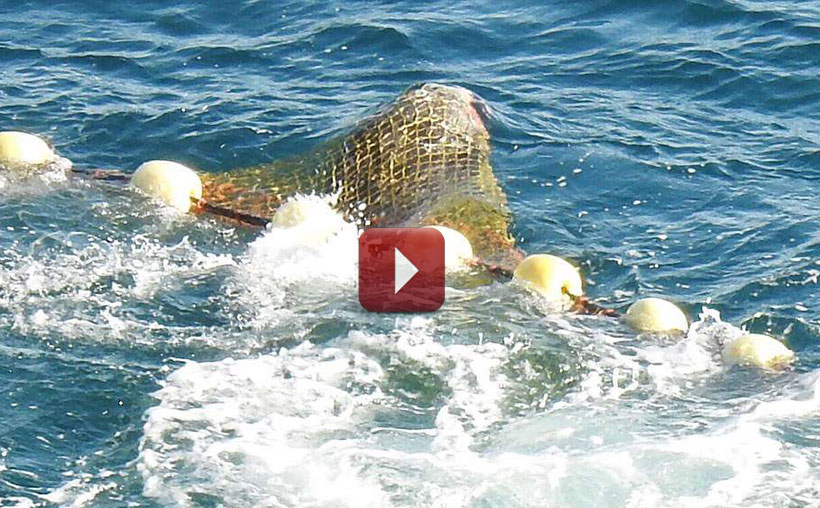 Bild: Ein Delfin versuchte durch das Netz zu flüchten und blieb daring hängen. Taucher rissen ihn aus dem Netz und schleppten das verängstigte wehrlosen Säugetier mit einem Boot unter die Planen an den Mörderstrand in den Tod.
