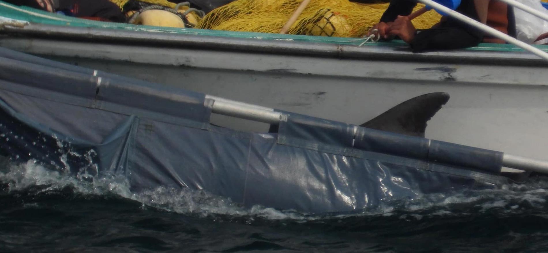 Bild: Die letzten zwei entführten Delfine ans Boot gefesselt werden zu den Schwimmkäfigen im Hafen von Taiji transportiert