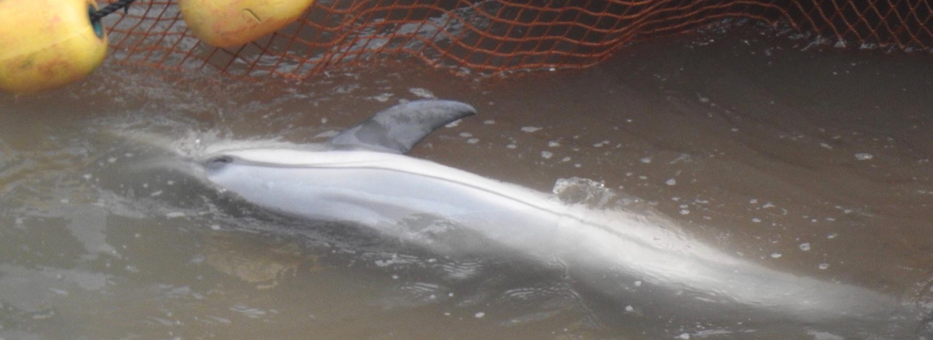 Bild: Ein Taucher wrestelt eine Streifendelfin, vom Netz herausgerissen, unter die Planen ans Ufer in den Tod. Der Delfin blutete aus dem Mund.