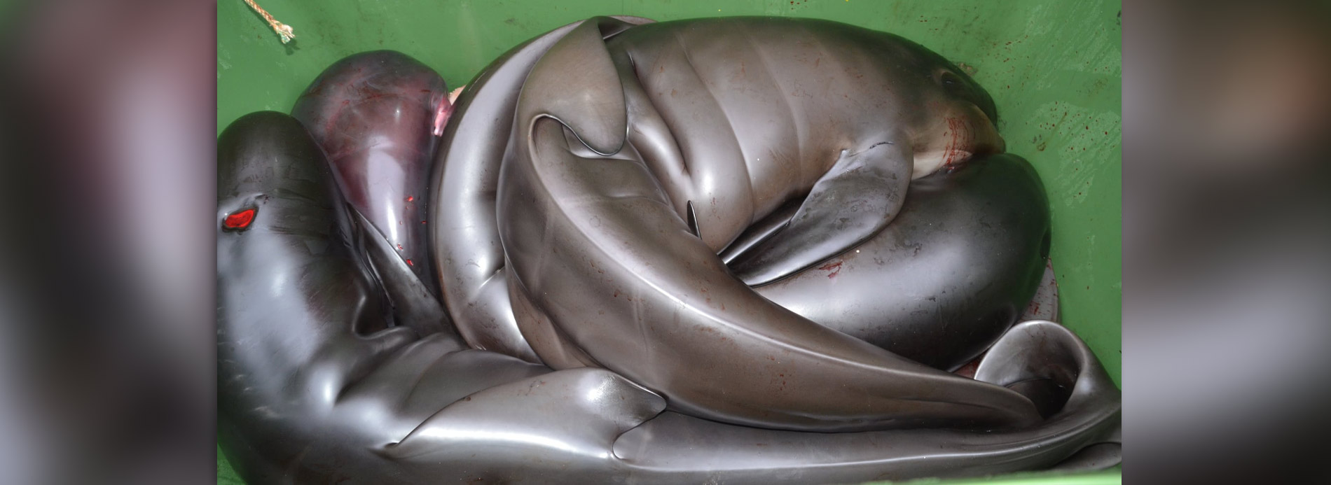 Ich konnte sehen, wie sie die Delfinleichen hochzogen, mit grossen Staplern transportierten und sie aufschnitten, dann die Leichen vor Kameras Fremder «schützen», während sie Fötus um Fötus herausrissen, sie in einen Plastikbehälter warfen - Abfall, der nicht gegessen oder benutzt werden sollte und nur als Müll behandelt wird. Eine total veraltete Tradition auf die die Färöer stolz sind, aber dennoch alles unternehmen um die brutalen Treibjagden und Massenmorde vor der Öffentlichkeit zu verbergen.