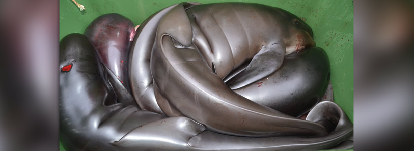 Später in dieser Nacht schlachteten sie die Leichen der Delfine, und ich war zurück, um auch das zu dokumentieren. Auf den meisten ausgeschlachteten Kadaver war auf dem Körper noch recht große Mengen Muskelgewebe übrig, nur gerade die großen "Filets" wurden in Stücken entfernt, sie nehmen sich nicht die Mühe und schneiden die kleineren Teile ab. Auf dem Boden siehst du Teile von Muskelgewebe, die aus unbekannten Gründen einfach herumliegen und entsorgt werden. Die Knochen werden nicht zum Kochen verwendet wie früher, Blubber wird entsorgt, fast niemand macht mehr Delfin-Walöl, die Flossen werden nicht mehr zur Ruderherstellung verwendet - also werden irgendwo rund 40-50% des Körpergewichts entsorgt und oft ganze Kadaver junger und Babydelfine.