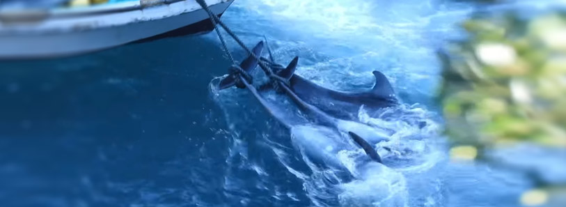 Mit der Schwanzflosse an ein Boot gefesselt, zog der Mörderabschaum mehrere Leichen der Teenager Gruppe unter den Planen heraus um sie ins Mezgerhaus zu schleppen, wo sie hauptsächlich für eine Düngerfabrik zerstückelt werden. Delfinfleisch ist toxisch, mit bis zu 200 verschiedenen Umweltgiften belastet, Gesundheit gefährdend, von dessen Verzehr raten Fachärzte unbedingt ab.