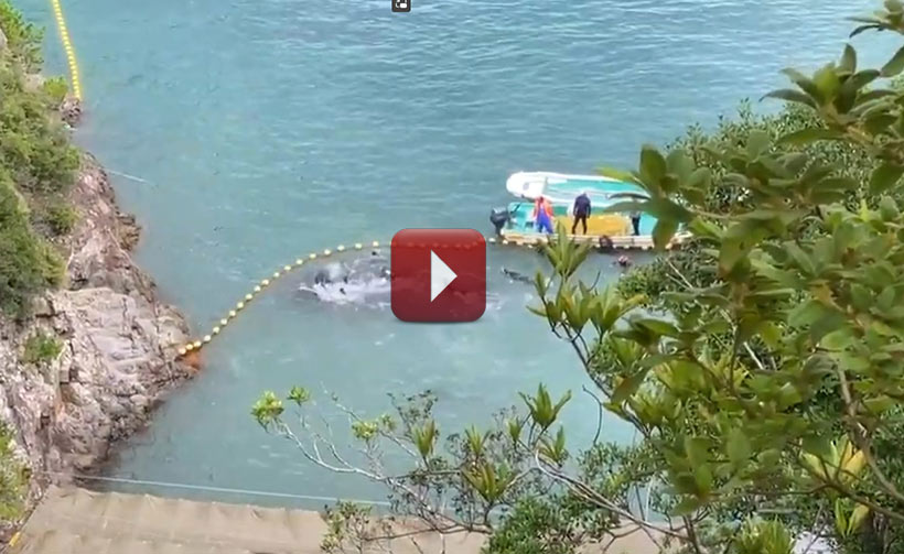 追いかけられていたのは、1頭の赤ちゃんと、1頭の若い個体を含むハンドウイルカの中型の家族、およそ80頭。追い込み猟で許可されている種の中で、ハンドウイルカはカマイルカに次いで速く泳ぐ。カマイルカは縦横無尽に泳ぐがハンドウイルカは、比較的直進性が強い泳ぎをするので、バンガーボートに追いかけられ、あっという間に太地漁港近くまで追い込まれてしまい、すぐに畠尻湾に押し込まれ、網で囲われてしまい、活動家からイルカを殺したり捕獲しているようすを撮影されないように設置されたグレーのシートが影浦湾奥に張り巡らされた。