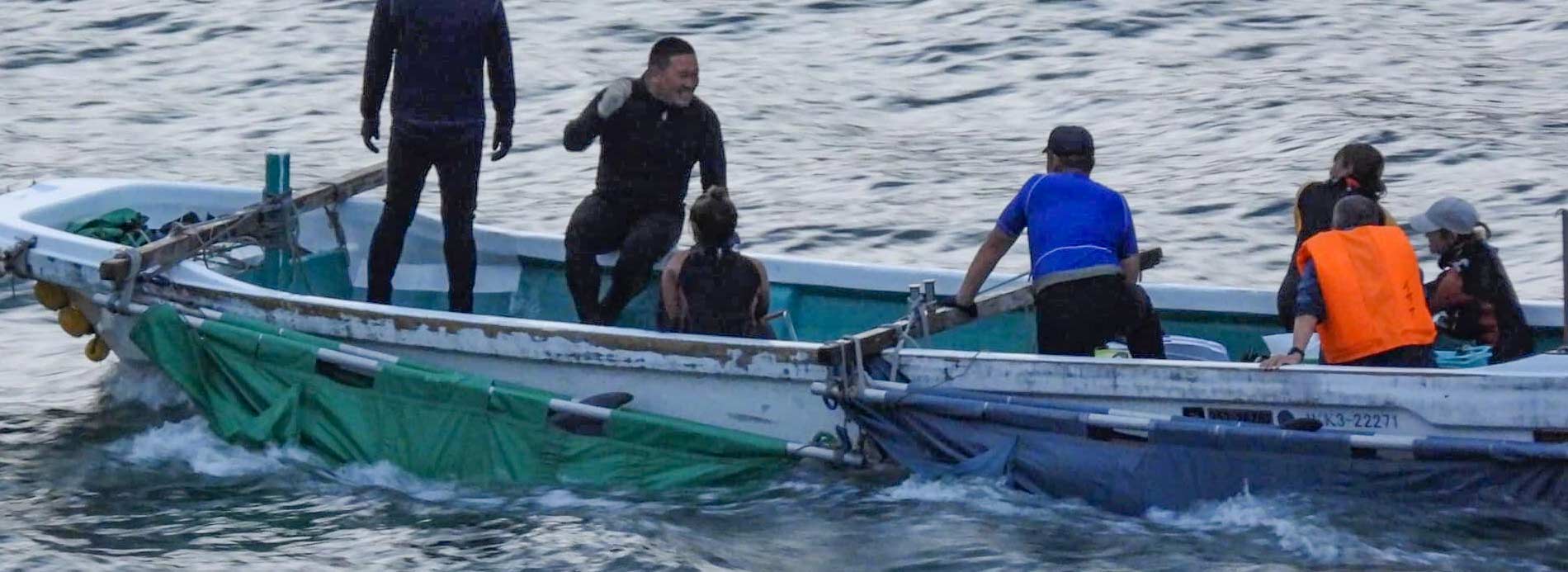 その後、猟師達は港に戻り「太地町立くじらの博物館のドルフィントレーナー」と株式会社日本ドルフィンセンターが経営する「ドルフィンリゾートのドルフィントレーナー」が到着するのを待ち、複数人ずつスキッフボートに乗り合わせ、影浦湾に戻ってきた。
