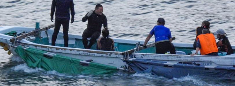 2022年10月5日 午前9時49分、燈明崎の南東方向に、11艘のバンガーボートが一列に隊列を組んでイルカ達を追い込んでいることを確認。(1艘は船体の故障と思われる状態で先に寄港していた)。