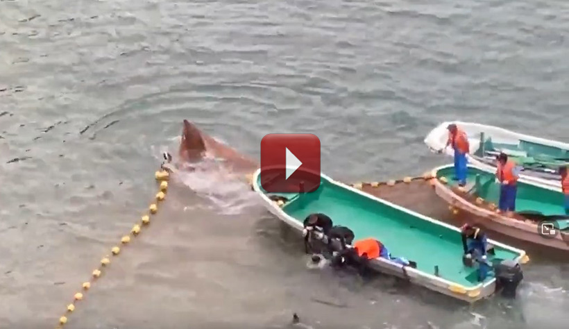 Bild by Ren Yabuki, vertrettend für Dolphin Project: Delfine versuchen nin Panik durch das Netz zu flüchten um der Gewalt zu entkommen
