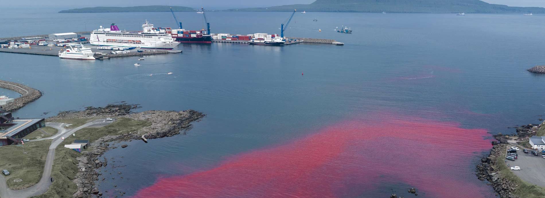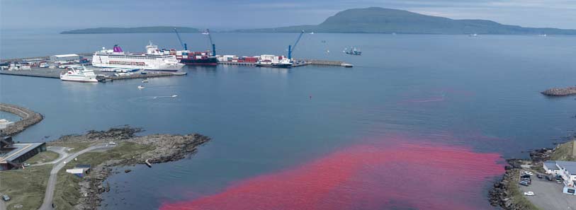 Wie die Passagiere auf dem Kreuzfahrtschiff sah ich, wie sich das scharlachrote Leichentuch über das Blau des Schiffes ausbreitete Bucht, die das Meer mit dem Lebensblut einer ganzen Familie von Walen, Vätern, Müttern, schwangeren Müttern und Kindern färbt. Ja, ich nenne sie Kinder, denn wenn ich die jungen Kälber sehe, sehe ich meine eigenen Kinder und den Abscheu vor der bloßen Vorstellung, dass ihnen eine solche Gräueltat zugefügt werden sollte. Wie kann ein vernünftiger und mitfühlender Mensch in einer Welt existieren, in der es solche Psychopathen gibt, die in der Lage sind, eine so furchterregende, entsetzliche Übung in mörderischem Horror durchzuführen? Die Antwort ist, dass wir es nicht können, und es ist eine Kombination aus Traurigkeit und Empörung, die uns dazu treibt, auf jede erdenkliche Weise einzugreifen, um den Schmerz zu beenden. Der Schmerz, den die Opfer erleiden, und der Schmerz, der mit jedem unnötigen und unnötigen Tod in uns schwelt. Sie haben kein Recht auf ihren lasziv-schädigenden Nervenkitzel. Sie haben kein Recht auf ihre perverse Befriedigung. Diese psychopathische Barbarei muss beendet werden, und sei es aus keinem anderen Grund als der Wahrung unserer geistigen Gesundheit und der Notwendigkeit, unsere Menschlichkeit zu respektieren. Bitte kommentieren Sie auf der Facebook-Seite der Ambassador Cruise Lines und fordern Sie sie auf, von Besuchen auf den Färöer-Inseln Abstand zu nehmen. Foto: Obwohl wir zu spät ankamen, um das Massaker zu stoppen, fingen unsere Drohnen den scharlachroten Schleier aus Blut mit dem Kreuzfahrtschiff Ambition im Hafen ein.