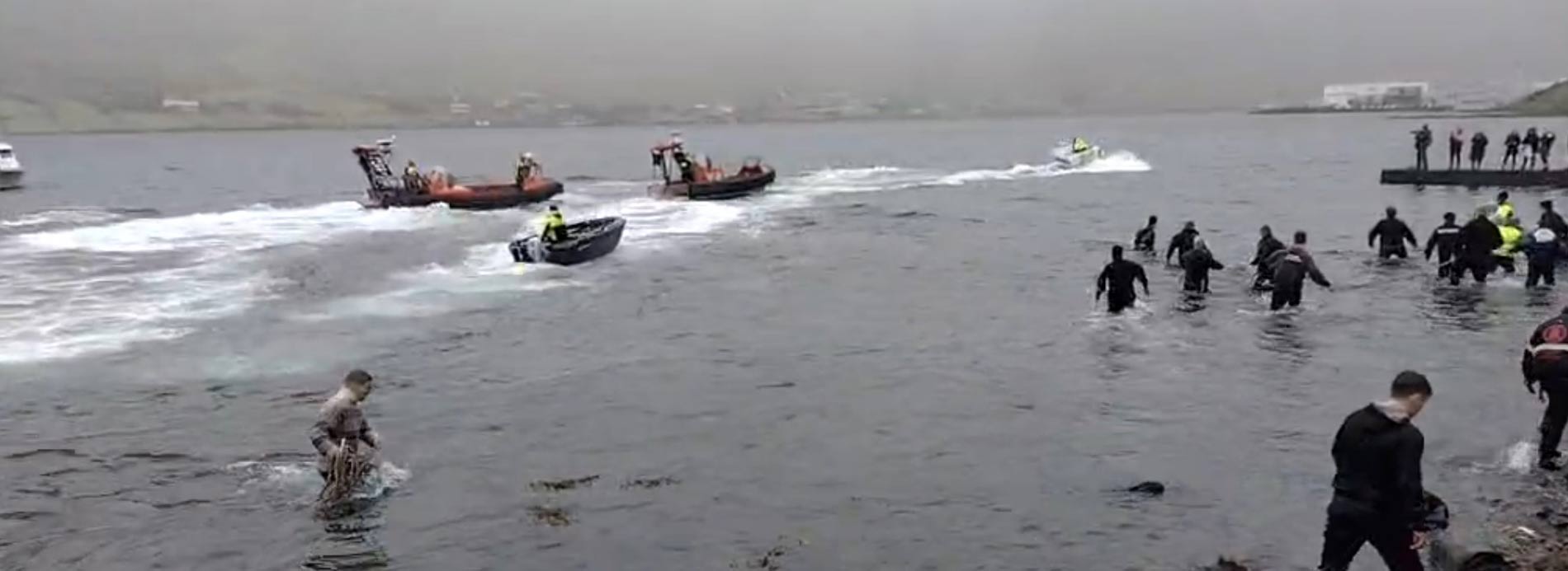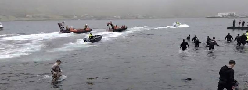 Färöer Medien berichteten, dass kurz nach Mitternacht, eine Treibjagd stattfinden würde, es seien 50-100 Grindwale, schrieben sie. Dies könnte durchaus realistisch sein, denn Pilotwalfamilien treffen sich zuu einer grossen Gruppe irgendwo nach Portugal und reisen zusammen in den hohen Norden bis nach Grönland. Die Pilotwale reisen in Routen, die an den Färöer Inseln vorbeiführt und sie in den Fjorden rasten und ausruhen, damit sich ihre Babys und die älteren Delfine von der anstrengenden Migrations-Reise erholen können. In den Fjorden oder kurz davor werden die Pilotwal Gruppen von Luxusschiffen und Speed Booten der Färöer abgefangen und im Blutsport extrem brutal an den Strand terrorisiert. Die längste Treibjagd die mir bekannt ist, dauerte über 7 Stunden. Die Delfinmorde in den Dänisch-Färöer Inseln sind reine Lustmorde Wahnsinniger, dies hat nichts mit Nahrungsbeschaffung zu tun. Viele Färöer sind gegen diese brutale Lust-Praktik, doch wenn sie sich öffentlich darüber äussern, werden sie von den Mörder.Psychopaten schickaniert und Terrorisiert. Die Dänisch-Färöer Regierung lässt dies zu, weil sie selbst in diesen Verbrechen der Delfin-Massenschlachtungen integriert ist. Das NAVY Patrouillenschiff Brimil der färöischen Regierung war seit Anfang der Treibjagd dabei und half danach die Leichen zu transportieren oder zu entsorgen.