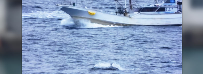 Japanische Tierschützen nennen die Jagdschiffe von englisch übersetzt Knallerboote, weil die Killer während den Treibjagden mit einem Hammer auf ein Eisenrohr schlagen, das am Jagdschiff seitlich befestigt ins Wasser ragt. Damit erzeugen sie einen lauten ohrenbetäubenden unterwasserknall, vor dem die Delfine fliehen. So gelinget es den Killern die vom Unterwasserlärm, einer gebildeten Wand auf 12 Jagdschiffen, fliehende Delfingruppen in die Bucht zu steuern. Diese Treibjagdmethode lernten sie 1969 von SeaWorld aus den USA, die die Killer anheuerten, Delfine für Delfinshows zu fangen. Jahre später kollabierten die Fischbestände in Japan durch Überfischung, die japanische Regierung begann mit dem ‘Pest Control’ Programm, eliminieren von Meeressäugern aus dem Ozean durch Tötung. Im Untertitel nannten sie das Programm ‘Regulierung der Meeressäuger Bestände’.