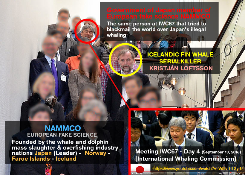 Japan hat die NAMMCO mit den berüchtigten europäischen Massenmörder aufgebaut, unter ihnen der isländische Finnwal Serialkiller Kristján Loftsson, um behauten und nachweisen zu können, dass die Europäer auch Wale und Delfine töten, ‘darum tun wir das auch’. Der Zusammenhang von Japan und der NAMMCO wurde 2018 bewiesen. Die japanische Regierung kauft Walfleisch von Norwegen und Island, obwohl in Japan kaum eine Nachfrage besteht, im Gegenzug bevorzugt sich Japan den Fisch dieser Länder zu kaufen. Es geht sogar so weit, In bezug auf die Massenvernichtung von Walen und insbesondere Delfine, haben sich die Stadt Taiji und die färöische Stadt Klaksvik zu Schwesternstädte zusammengeschlossen; natürlich nur unter Vorwand der Täuschung und wegen Schlachtungen von Delfinen: Taiji to Unite with Faroese in Sister City Agreement