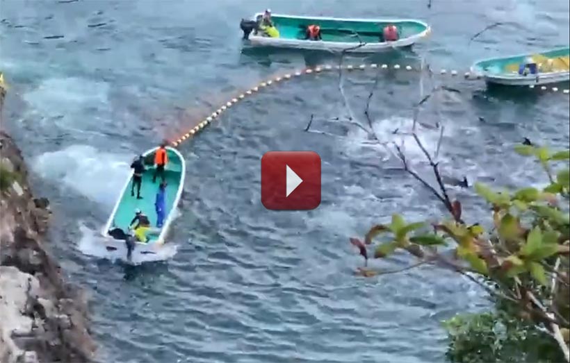 Am 19. Oktober 2023 ca. um 07:00 am Morgen, kamen Boote mit Killern und Trainern in die Bucht. Gleich darauf begangen sie die Delfine mit unglaublicher Gewalt zu quälen. Die Delfine wurden rücksichtslos mit Booten und deren hochdrehenden Motoren überfahren. Einer nach dem anderen wurde von Tauchern festgehalten, an ein Boot in ein Netz geschoben, dann mit dem Boot unter die Planen in den Tod oder für die Gefangenschaft auserwählt.