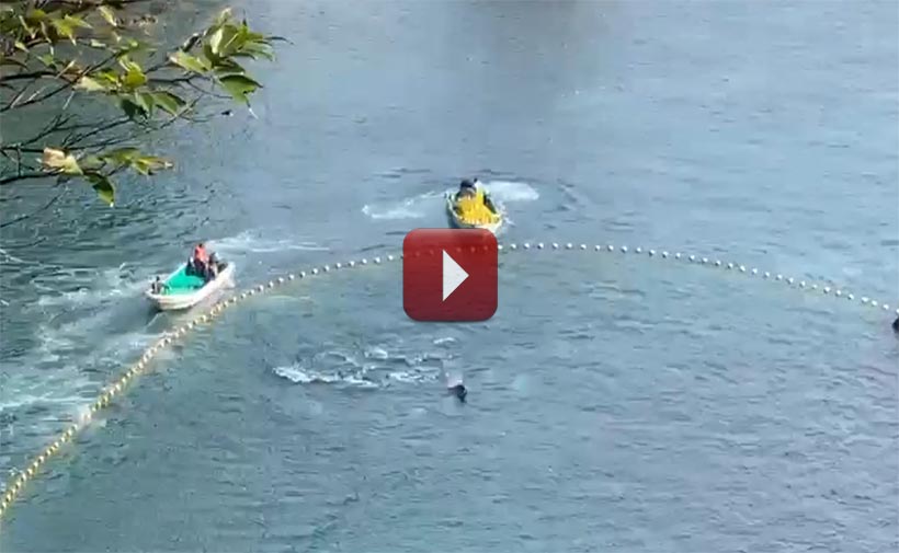Die Delfine versuchten verzweifelt zu fliehen, aber sie wurden in immer flachere Gewässer gejagt, und um 8:39 Uhr waren sie bereits kurz vor dem Fischereihafen von Taiji. Zu diesem Zeitpunkt haben die Delfine keine andere Wahl, als nach Nordwesten zu fliehen, vor dem Hafen im rechten Winkel abbiegen und in Richtung Hatakejiri-Bucht zu schwimmen, wo sie gefoltert und getötet werden.