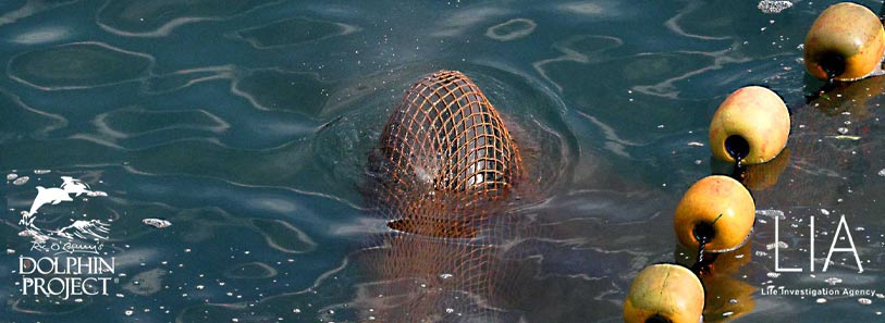 Ein Taucher in einem Neoprenanzug schwamm zu ihm, hielt ihn an der Vorderen Flosse fest und riss ihn aus dem Netz. Der Delfin bewegte sich nicht mehr, er war während der gewalttätigen, brutalen Misshandlungen in der Bucht gestorben. Die Killer banden ein Seil um die Basis seiner Schwanzflosse, bedeckten das leblose Opfer mit einer grauen Plane und schleppten den Delfin unter die Planen am Strand. Ein Delfin, der Letzte im Netz vor dem Strand, schwamm den Killer auf den Motorbooten bis zum Schluss davon. Die wütenden Killer verfolgten das total verängstigte sanfte Säugetier unerbittlich. Der Delfin geriet in Panik, stürzte sich wiederholt an die scharfen Felsen und versuchte sich auf dem Meeresboden zu verstecken. Der Delfin blutete stark am Kopf blutete und seine Schwanzflosse war zerfetzt, vermutlich durch die hochtourigen Bootsmotoren verursacht. In einer Art Würgegriff hielt ihn ein Taucher fest, zog ihn an das Boot in ein schwarzes Netz, der wütende Killer schleppte ihn dann mit hoher Geschwindigkeit unter die Planen in das schmerzvollste Sterben.