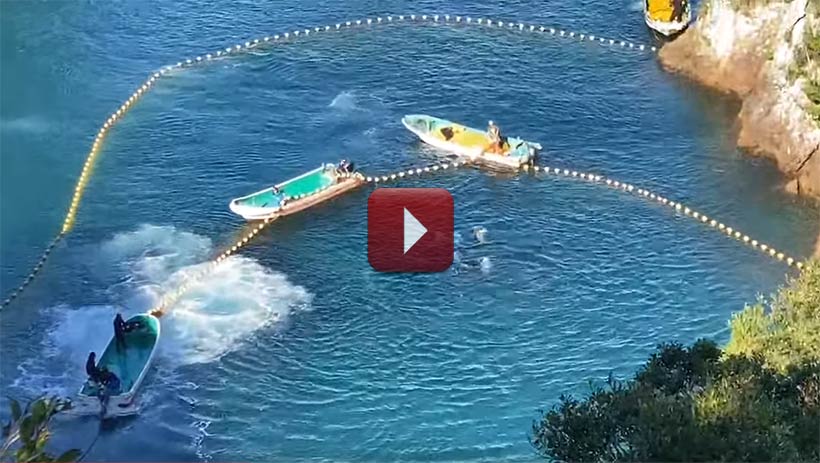 Um 13:33 Uhr scheiterte der verzweifelte Widerstand der Delfine und sie wurden schließlich in die Hatakejiri-Bucht getrieben und warenhinter dem Netz gefangen.