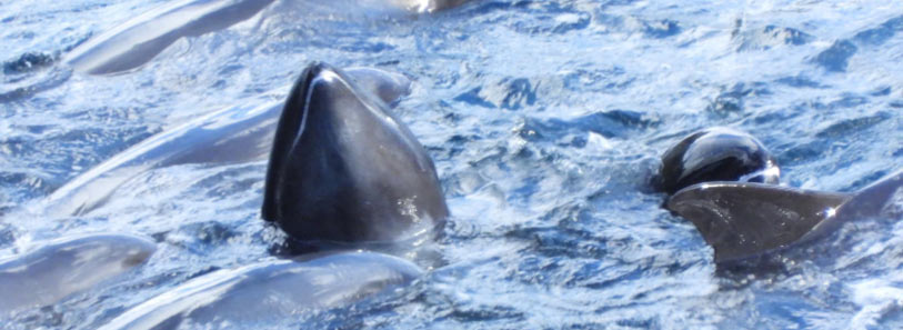 Die Killer waren gestern verzweifelt wegen schlechtem Wetter keine Delfine zu quälen und zu ermorden. Heut war das Wetter besser trotz schlechter Wettervorhersage. Ungefähr zwei Stunden nach Verlassen des Hafens von Taiji, fanden die japanischen Delfinmassenmörder eine Gruppe Melon headed whales (Breitschnabeldelfine).