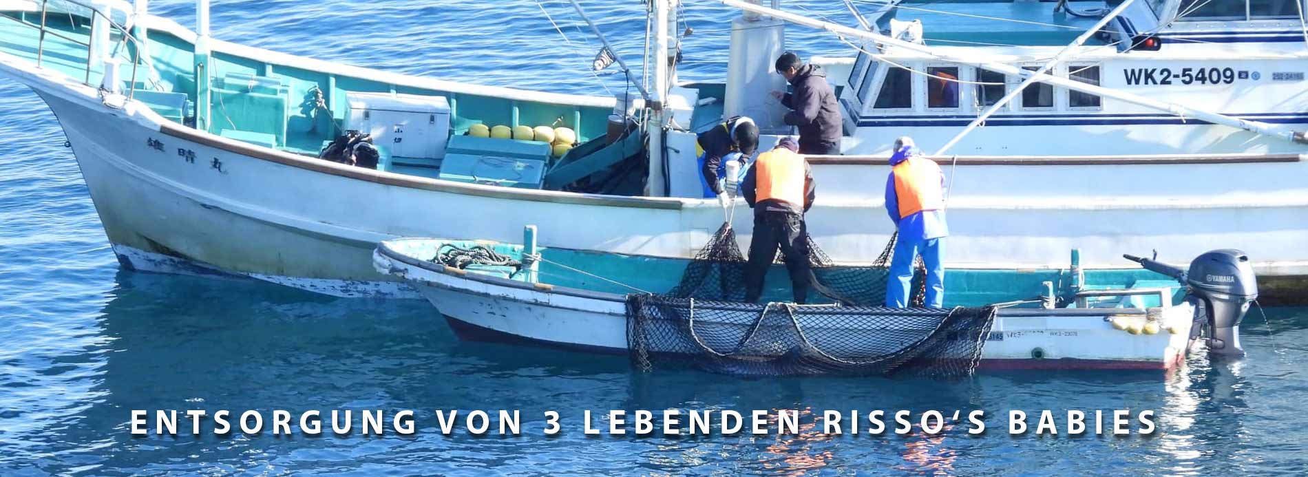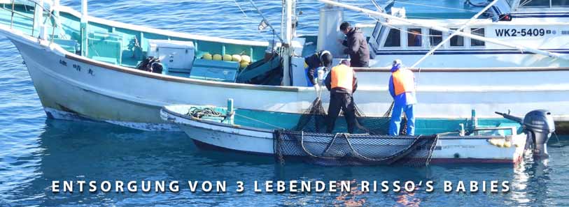 Der Livestream hatte schlechten Empfang, wir konnten die Delfine nicht genau erkennen, aber plötzlich sagte Kunito "Risso’s, Risso’s". Er filmte aus der Bucht und nur er konnte die Delfine, respektive die Spezies erkennen. Im Video von Kunito und Bildern ist das Verbrechen dokumentiert, das heute diesen sanften Wesen heute Morgen in Taiji Japan angetan wurde. Bitte seien Sie eine Stimme für diese Delfine und alle anderen hunderttausenden, die in Taiji auf selbe oder noch brutalere Weise mit enormen Gewalt misshandelt und getötet wurden. Bitte geben Sie den tausenden Babydelfinen eine Stimme, dessen Mütter ermordet und die hilflosen Kleinen lebend im Meer entsorgt wurden. Sie hatten keine Chance ohne Muttermilch zu überleben, wie auch diese kurz nach der Milch-Entwöhnten, die nie gelernt hatten selber nach Futter zu suchen, und alle diese hilflosen kleinen Delfinchen sind schutzlos den Raubtieren wie Haien ausgeliefert. Die Babydelfine wurden von den Fischern, Bzw. Killern lebend entsorgt, weil diese auf keine Liste geschrieben werden müssen, und so viel mehr Delfine getötet wurden als auf der Statistik erwähnt. Und sie hatten es heute wieder getan, mindestens 2 kleine Babys und ein schwerverletzter junger Teenager-Delfin hatten die Killer lebend im Meer entsorgt. Zu vergleichen ist das, als würde jemand Menschenbabys lebend im tiefsten Wald entsorgen/aussetzen, diese sind genauso hilflos und würden qualvoll verhungern wie die drei Babydelfine heute und alle tausende vo ihnen.