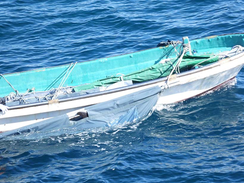 船が横並びしているのが遠くに見えた。まだまだ遠く、群れには逃げるチャンスが充分あったが、船隊は06時43分出港、このとき既に3時間近く経過している事から、フォーメーションの時間が長く、かなり体力が奪われていたと推測できる。