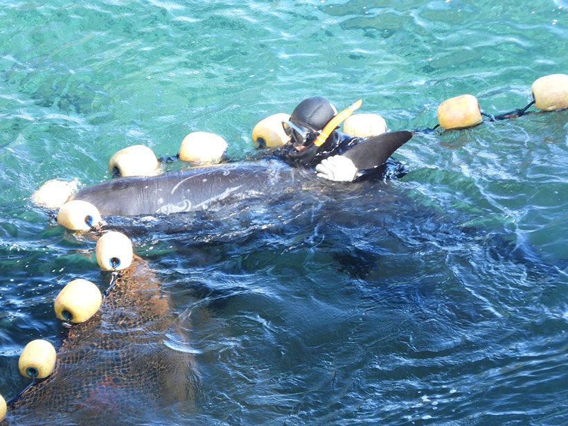 Nachdem die Formation bestätigt worden war, wurden sie mehr als 2 Stunden lang gejagt, und etwa 10 Delfine in die Bucht getrieben. Es handelte sich um eine Gruppe von Risso-Delfinen, darunter Mutter und Kalb Paare.
