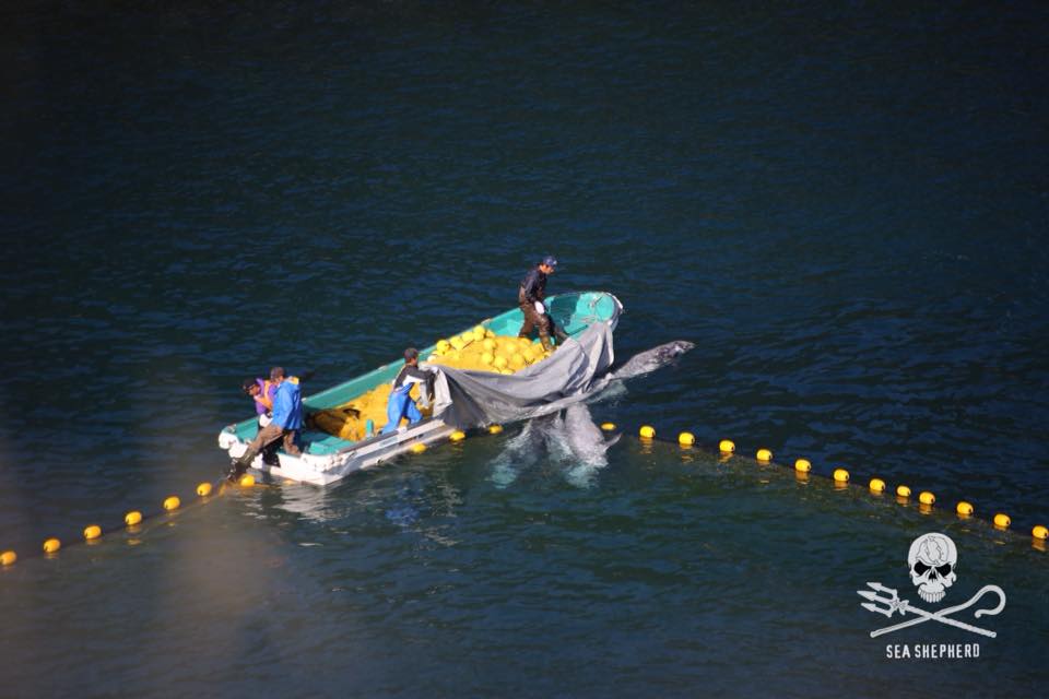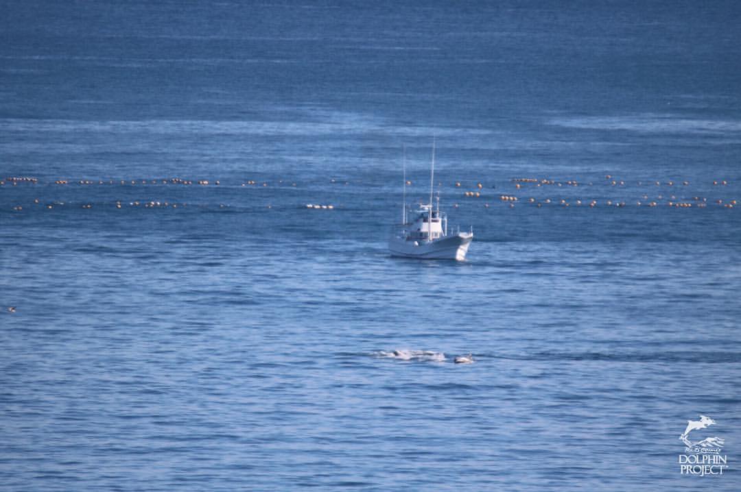 In Panik flüchteten ein paar Rissos Delfine in die Netze und verhedderten sich darin. Die Killer zogen sie mit Seilen an der Schwanzflosse befestigt mit ihren Motorboten aus dem Netz und schleppten die panisch verängstigten Meeressäuger direkt unter die Abschlachtplanen. Innerhalb nur einer Stunde war das Massaker vorbei.