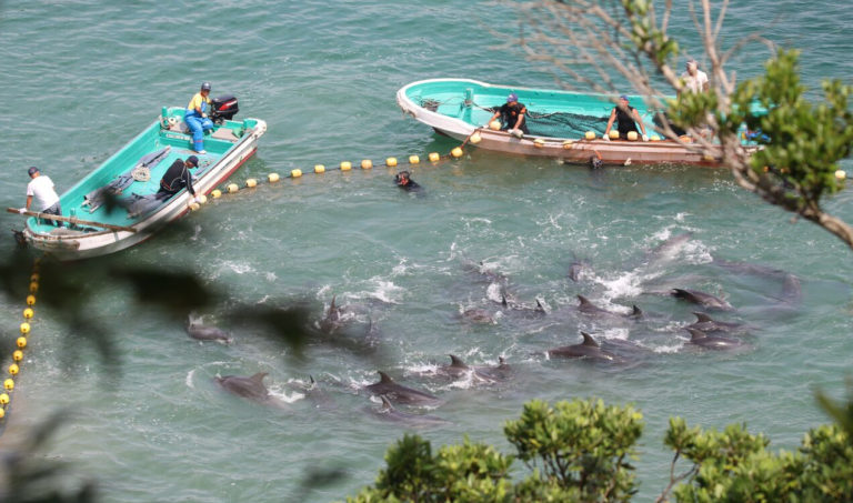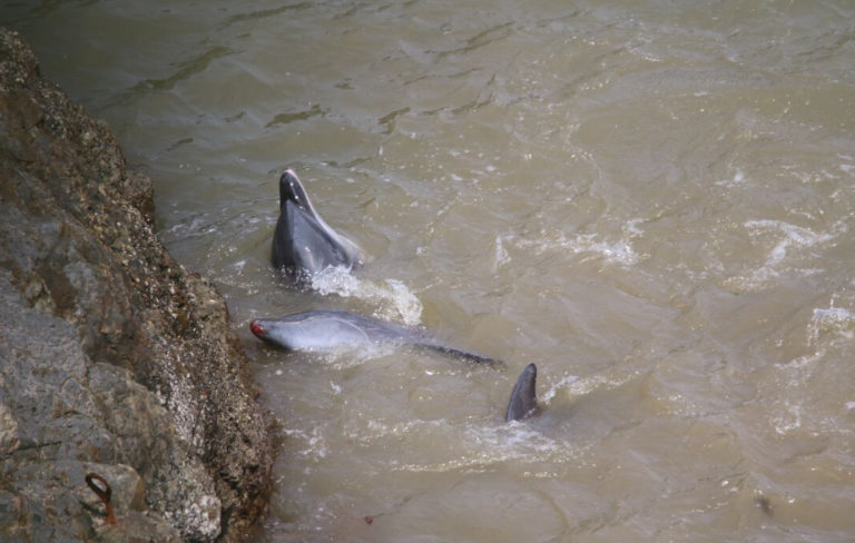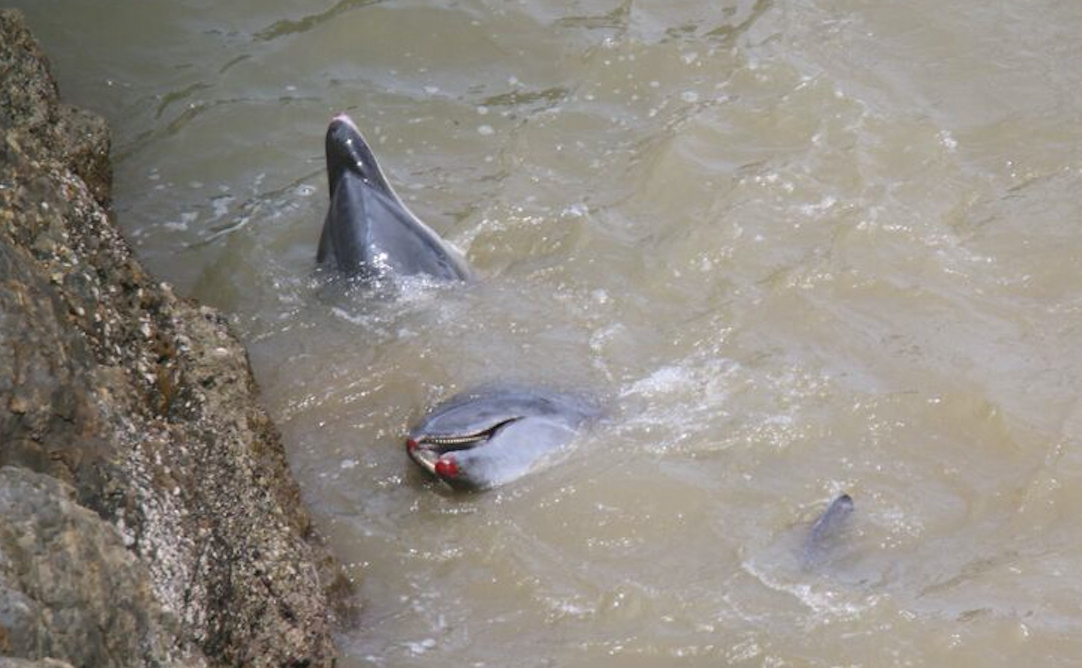 Im Laufe des Tags kamen die Delfine durch den rabiaten Umgang mehr und mehr in Panik und Erschöpfung. Einige verhedderten sich Netzen, andere warfen sich in der Panik gegen die schroffen Felsen und verletzten sich schwer.