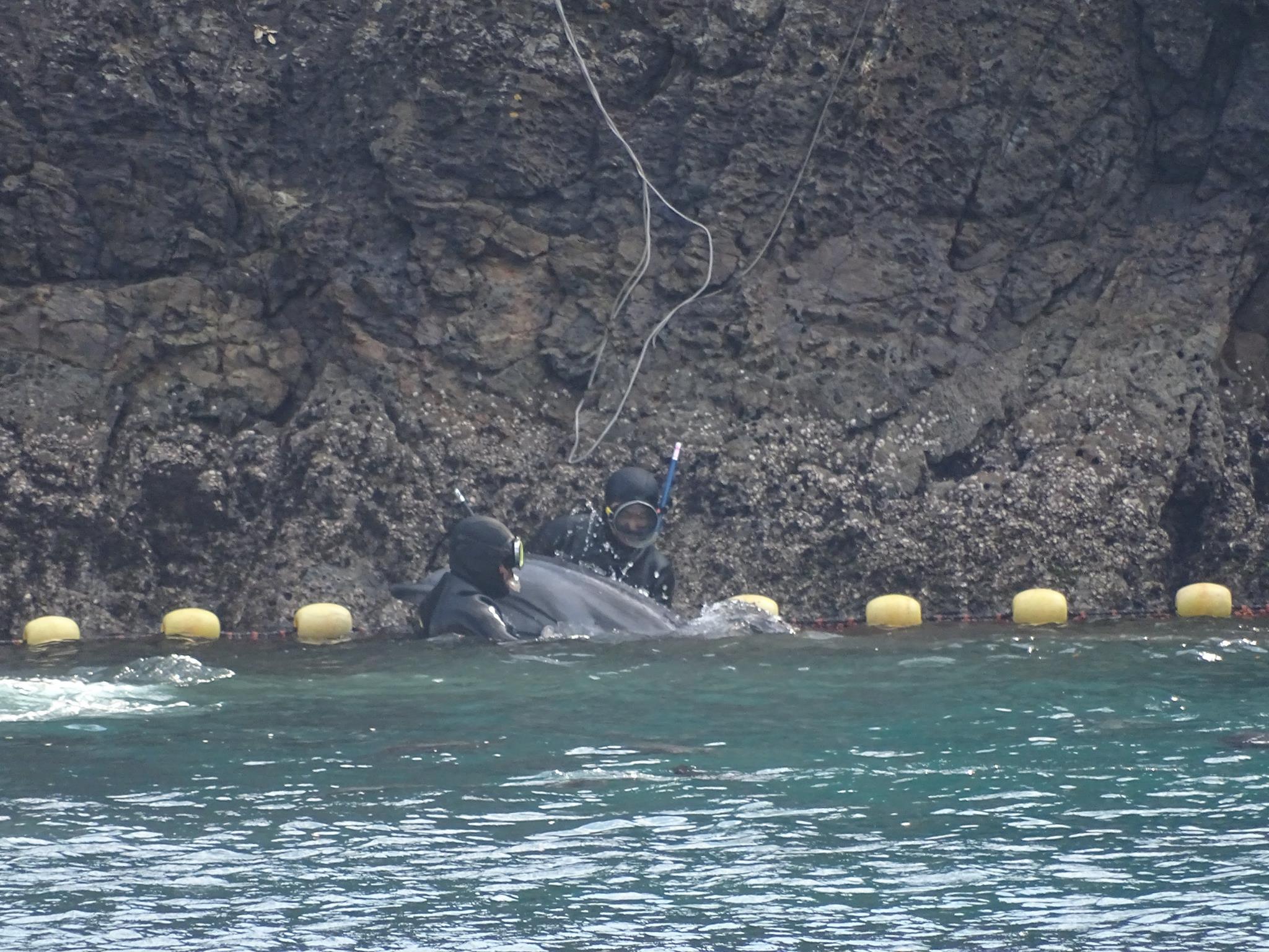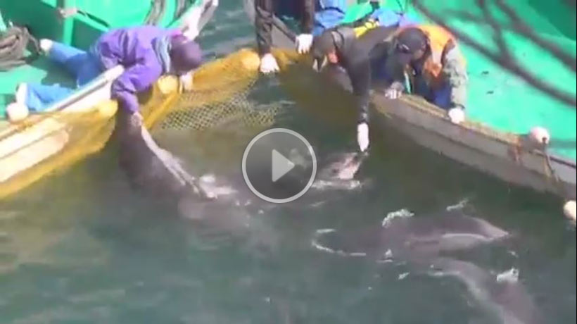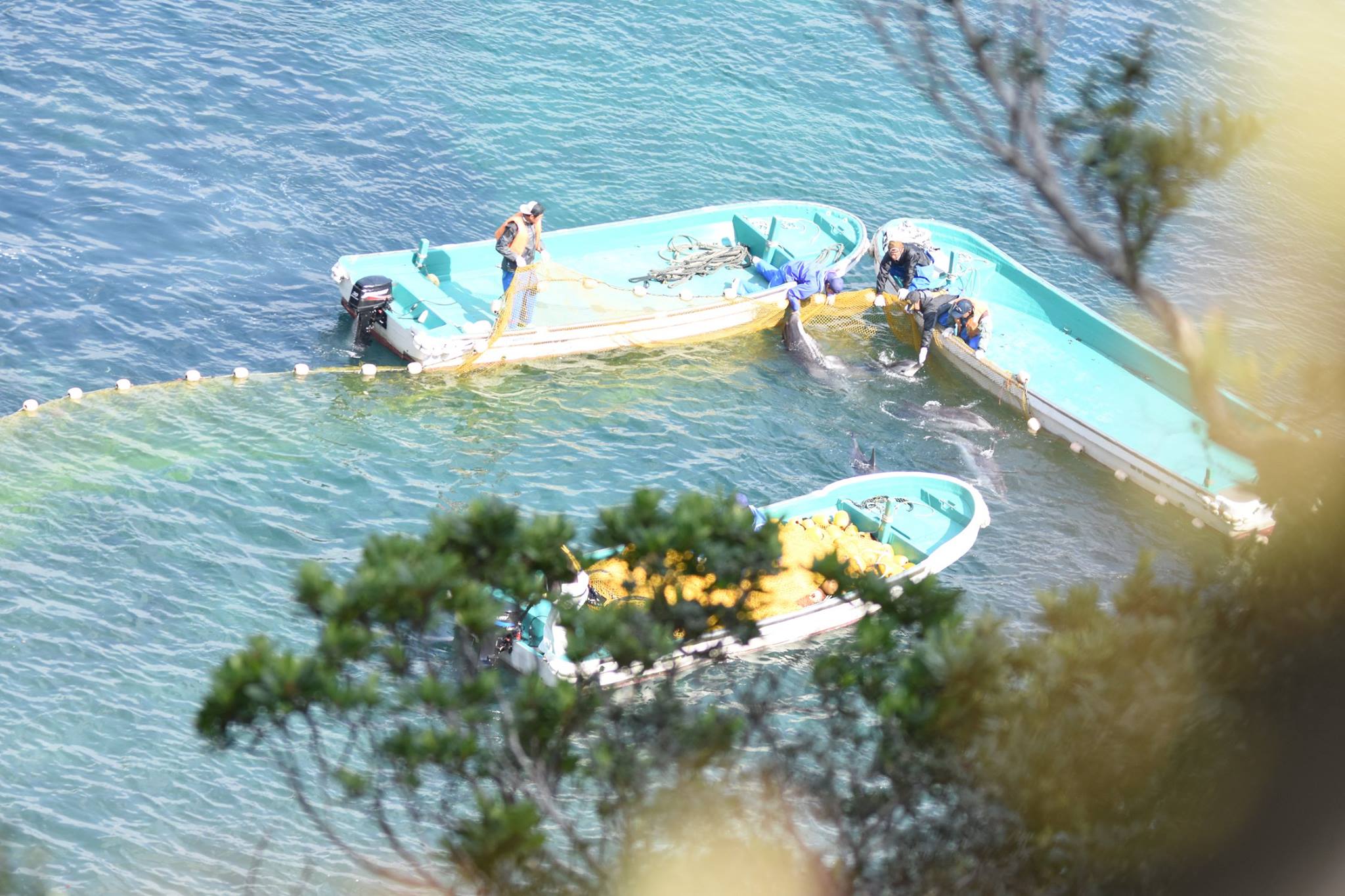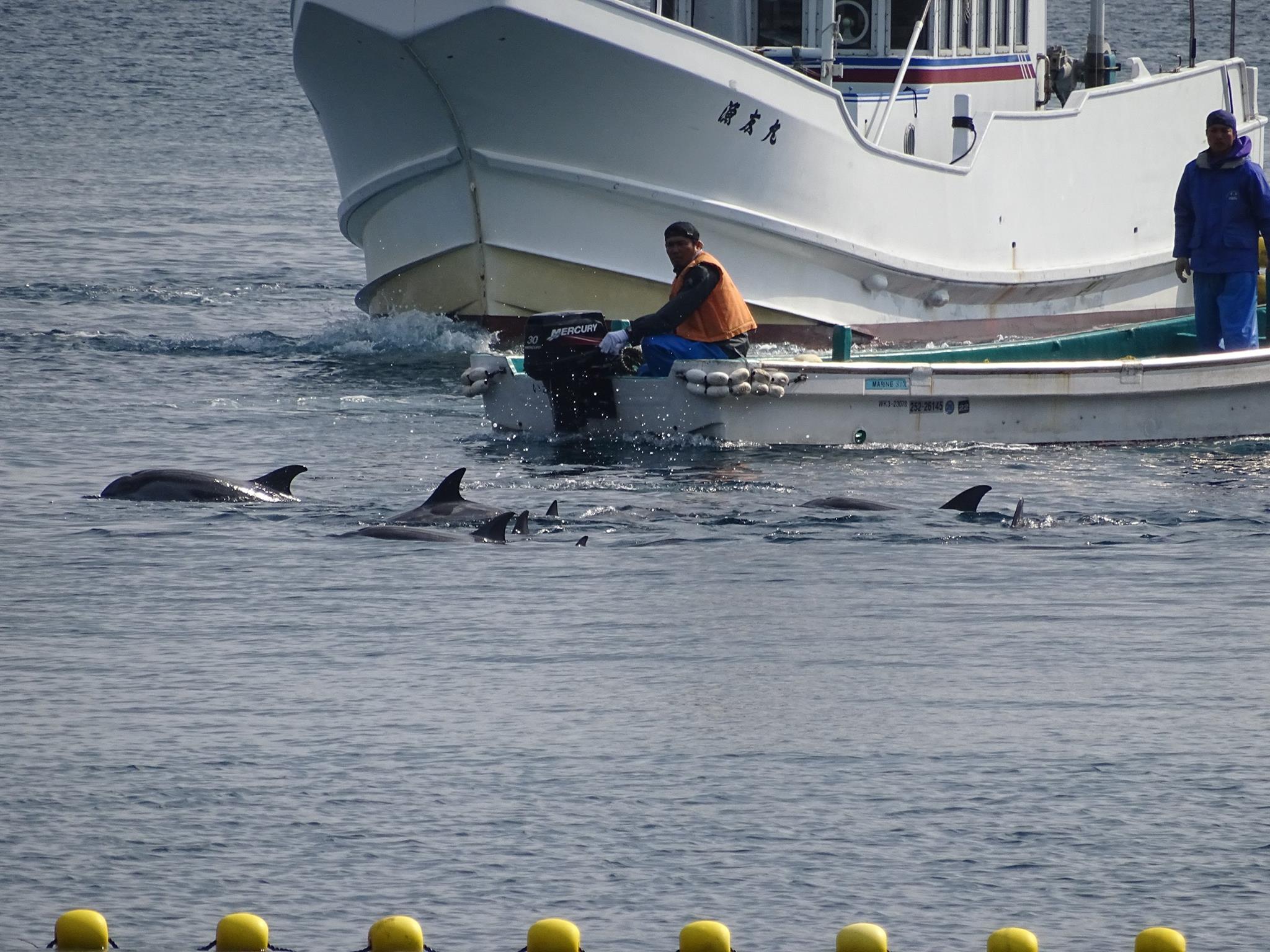 Die meisten der Familienmitglieder konnten der Schallwand aus Metall entkommen, 36 Delfinen gelang die Flucht nicht. Erschöpft und in Panik wurden sie von den Mördern in Netze in der Mörderbucht eingesperrt und die Misshandlungen nahmen ihren Lauf.