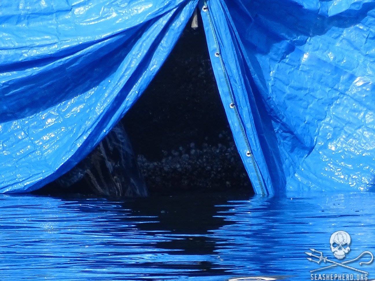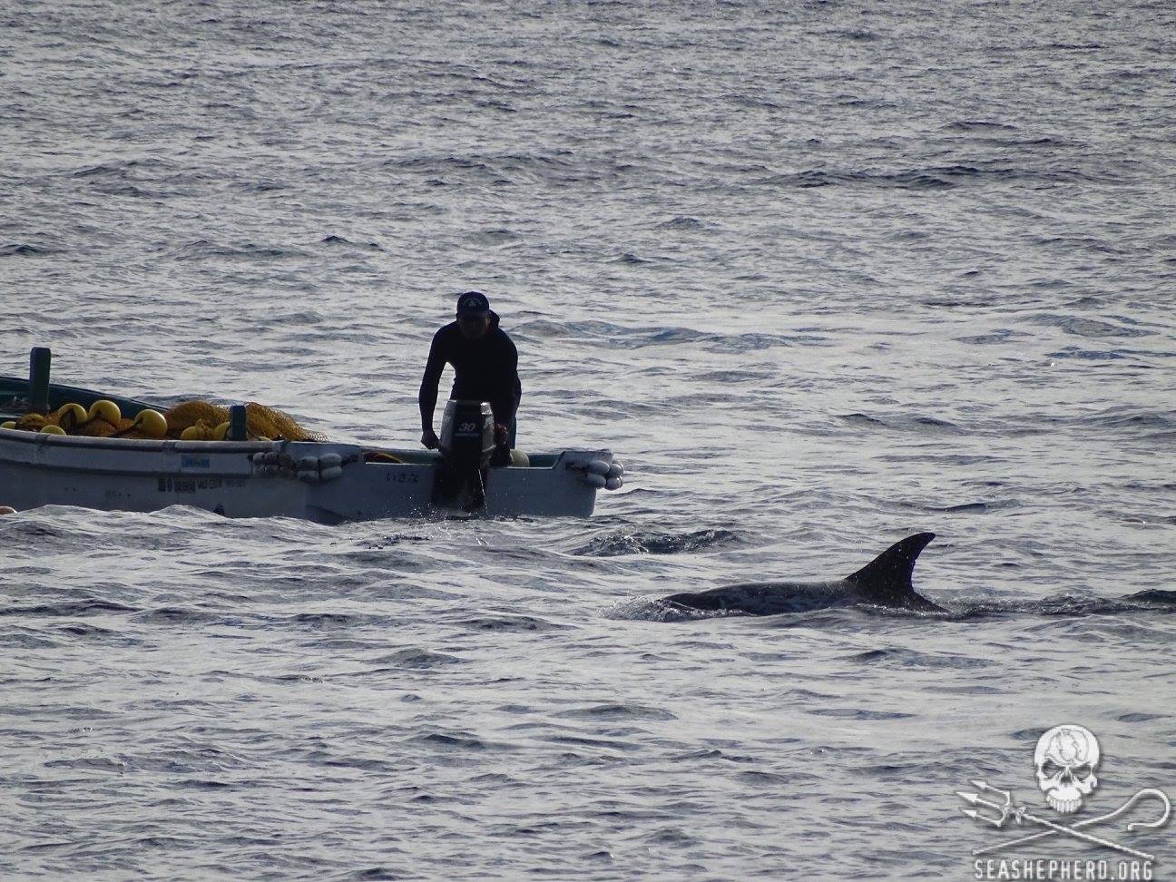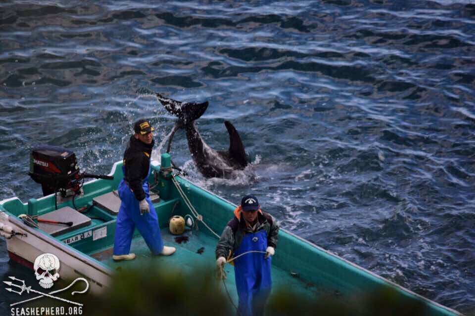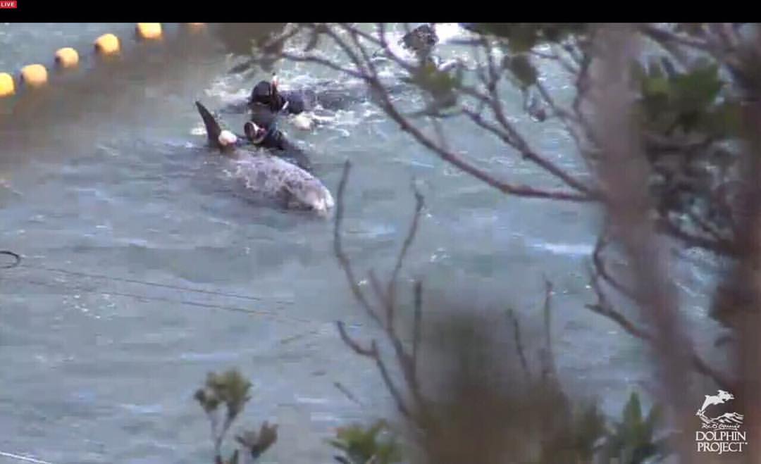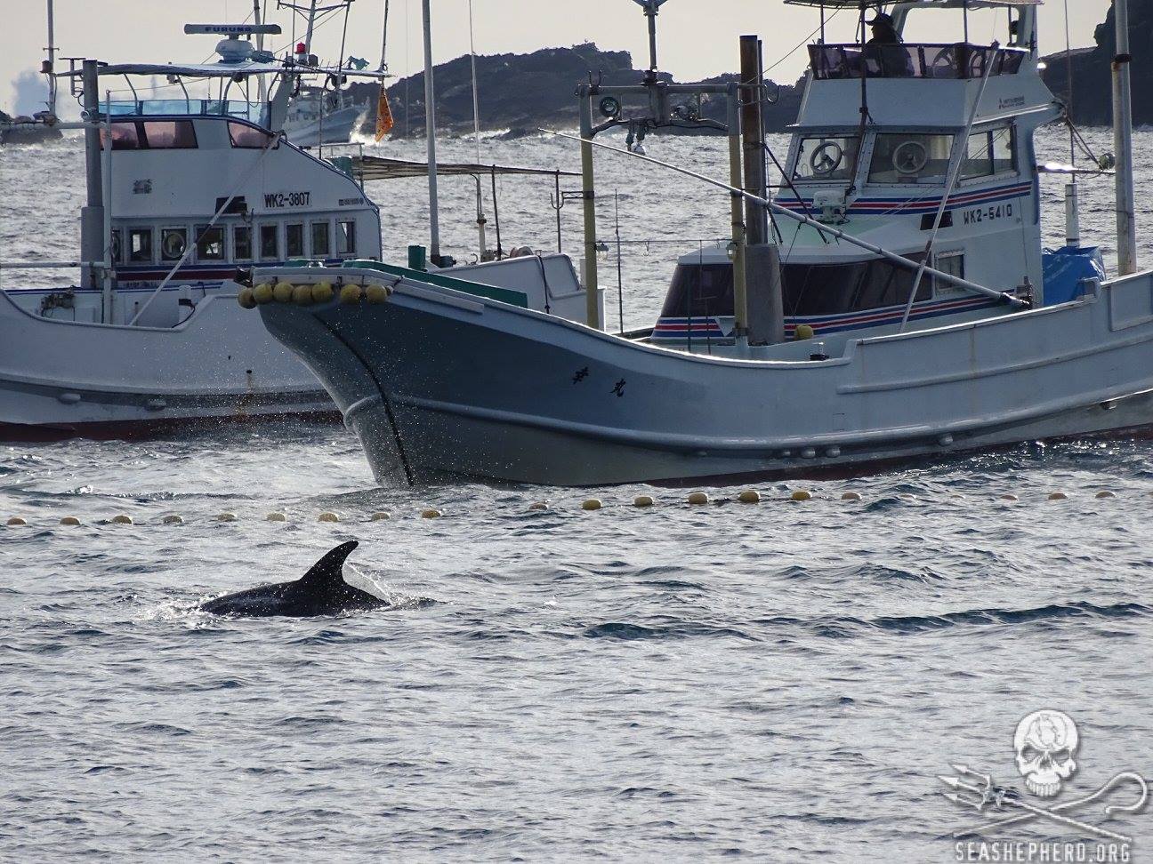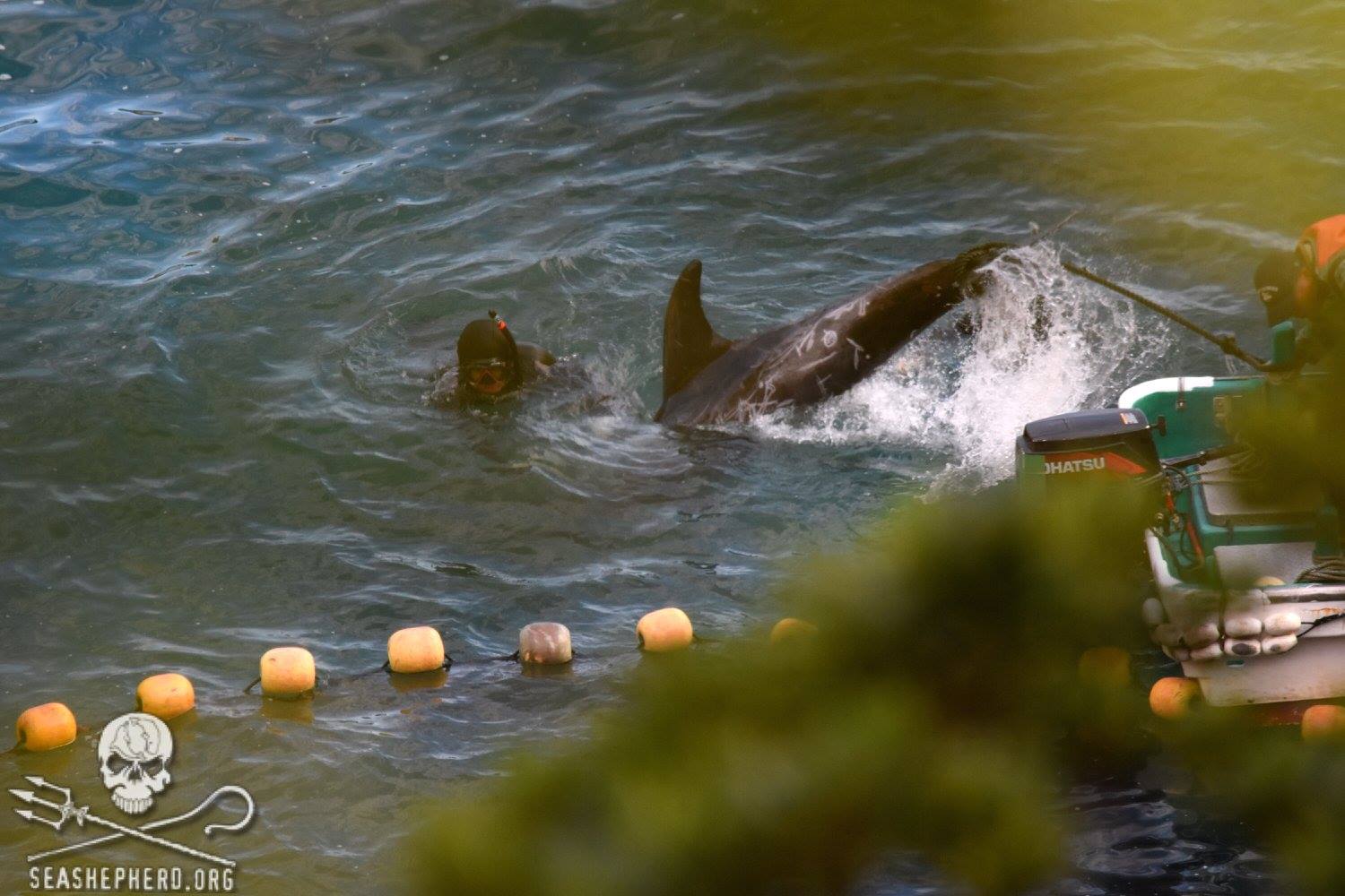 Einem Delfin gelang es über die inneren Netze in der Tötungsbucht zu entkommen, doch ein Kahn mit Killer hielten ihn auf und die Mörder banden den unschuldigen Delfin mit einem dicken Seil an der Schwanzflosse befestigt an ihr Schiff. Dieser Delfin wurde gewaltsam am Seil unter die Plane in der Tötung Strand gezogen, dorthin wo der Rest seiner Familie brutal abgeschlachtet wurde.