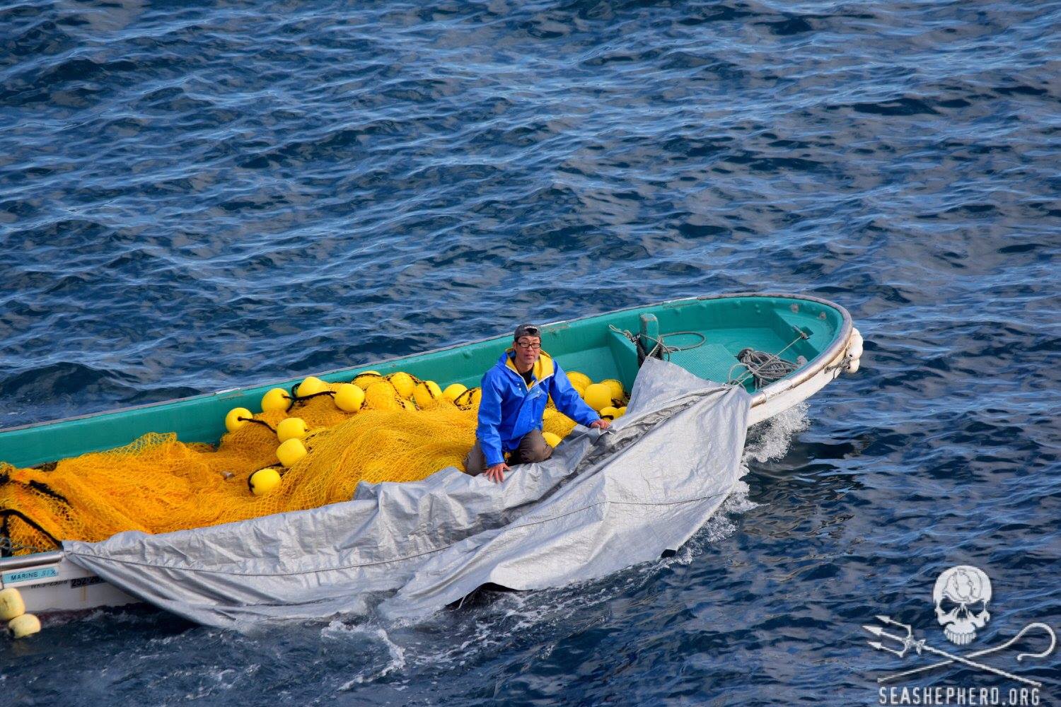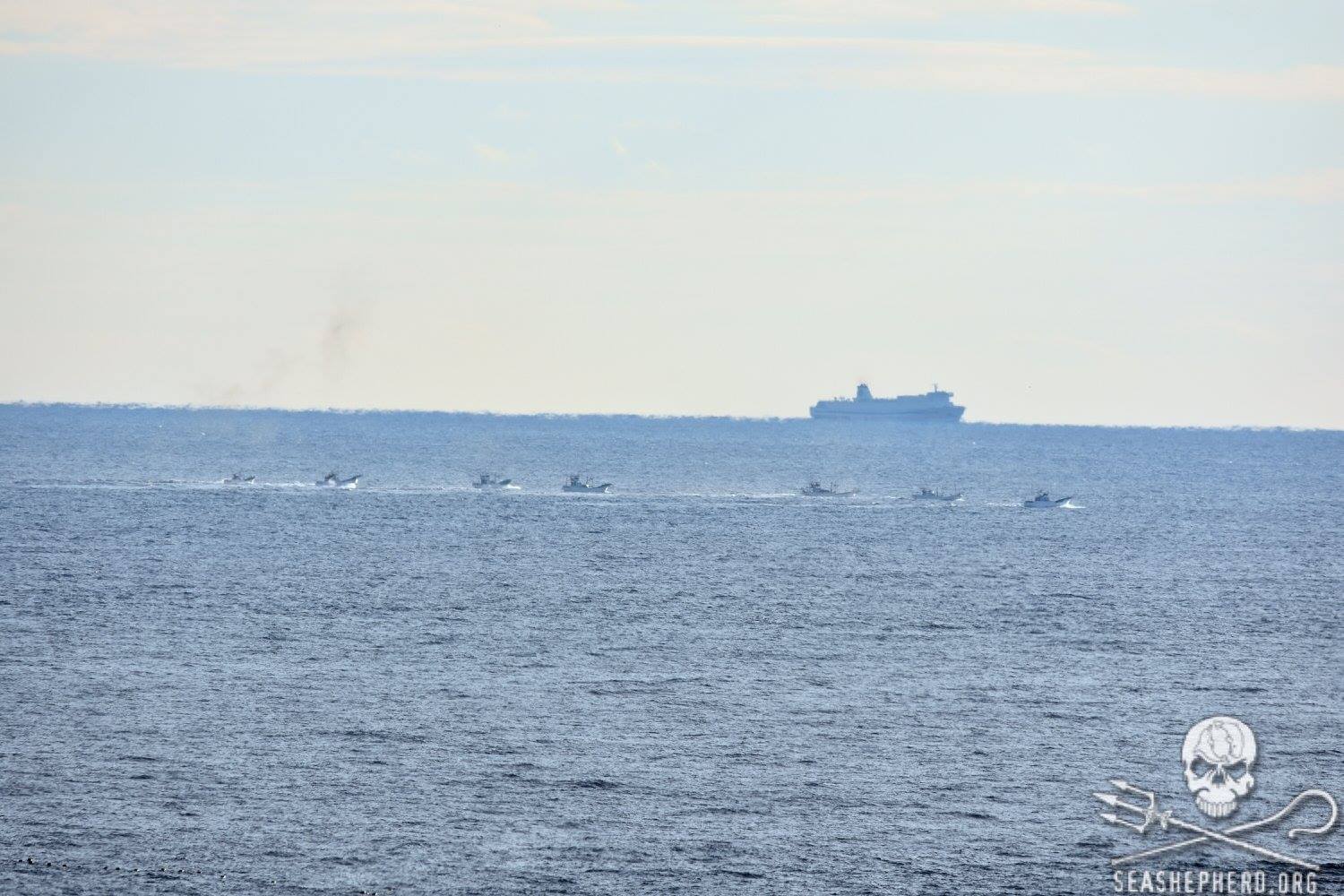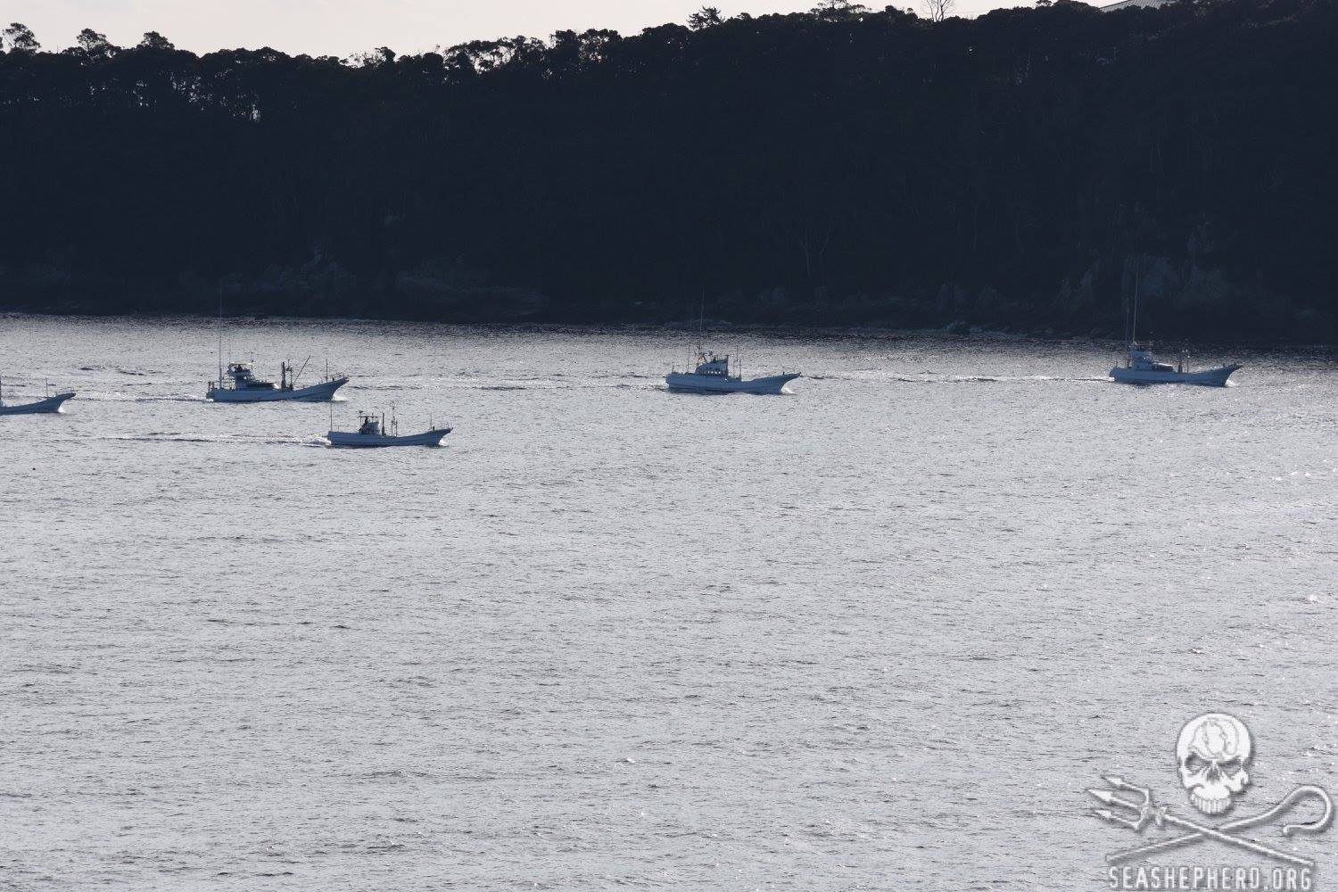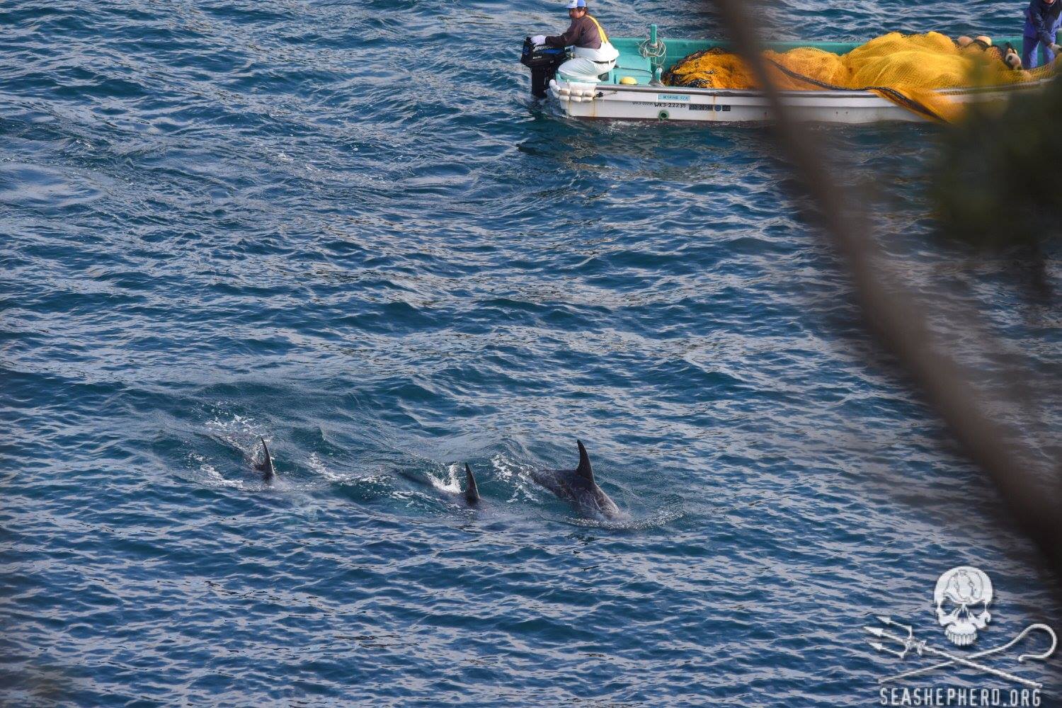 Um 7:15 Uhr Ortszeit Japan, nach nur 25 Minuten seit Start der Jagd, entdeckten die Killer eine Schule von sieben Risso’s (Rundkopf Delfine) Delfine. Sie bildeten mit ihren Schiffen, in der Nähe Küste, eilig eine Formation.
